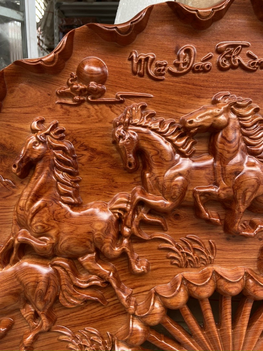 _ Tranh cánh quạt khắc tích mã đáo thành công được làm bằng chất chất liệu gỗ hương đỏ tự nhiên 100% _ Kt 50×100 dầy 4cm _ Tranh được khắc nổi tỉ mỉ ,tinh