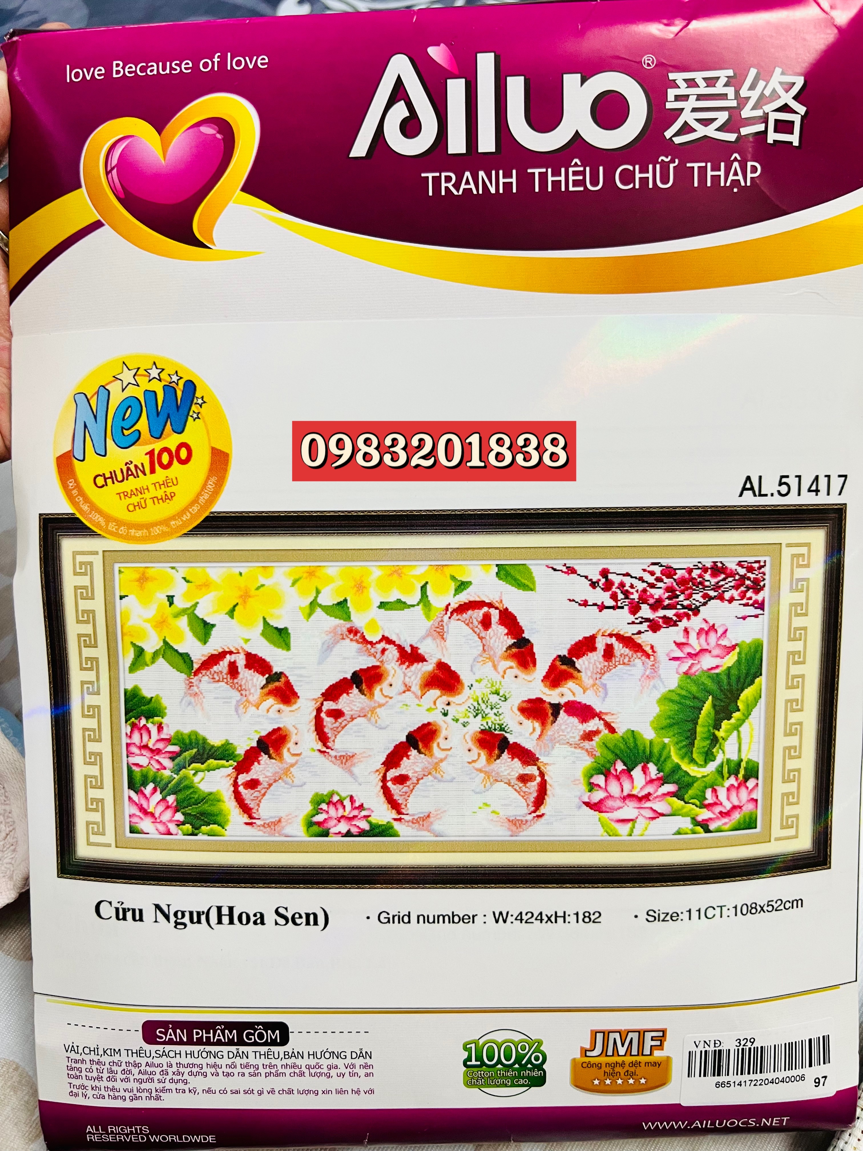 ✨Tranh thêu chữ thập Cửu ngư hoa sen AL51417, nền trắng không thêu, kích thước 108 x 52 cm