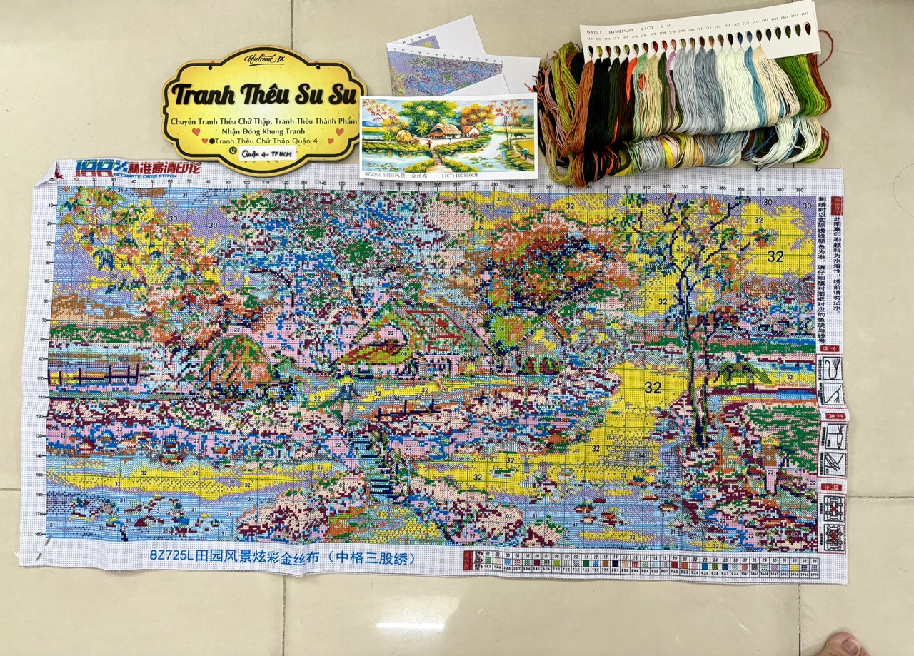 Tên tranh: Tranh thêu kín Phong cảnh làng quê Thể loại: Tranh thêu chữ thập (sản phẩm này là tranh chưa thêu). Kích thước: 50 x 60 cm Phần khách cần thêu trên tranh: thêu
