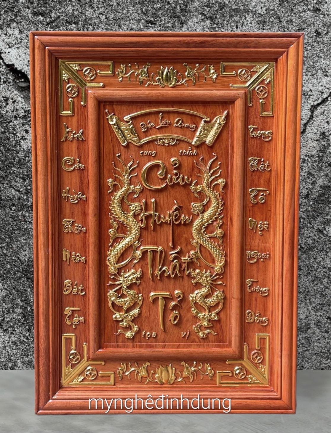 LIỄN THỜ THỔ TIÊN - CỬU HUYỀN THẤT TỔ ( Gỗ hương đá) Chất liệu; gỗ hương đá lục lạc , sơn pu chất lượng cao, mạ vàng Đài Loan Kích thước dày 3,5cm *cao