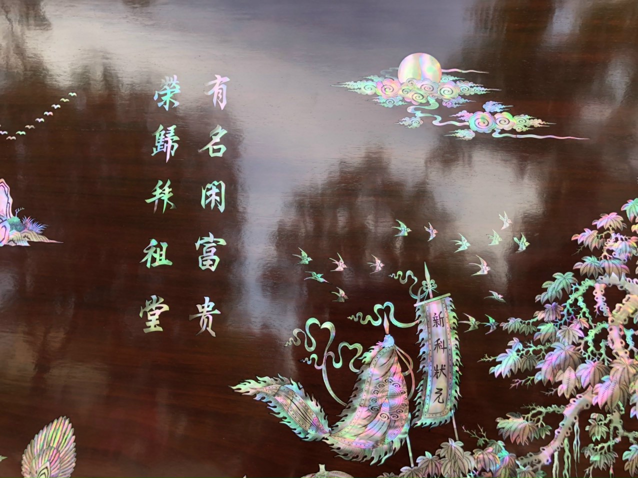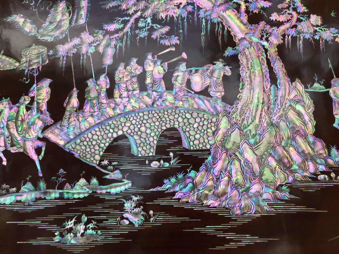 _ Tranh vinh quy bái tổ được cắt tỉa từng chi tiết xà cừ ốc đỏ ,lặp ghép vào với nhau vô cùng công phu, tinh sảo ,kỳ công .Đi hầu hết tất cả mọi đường nét đều được gọt tỉa chỉnh sửa hoàn toàn bằng tay thủ công .Đồng thời ván tấm gỗ gụ được kiểm định kỹ lưỡng như cho vào tắm nước vôi ,rồi cho vào sấy gỗ khô kiệt ,Mục đích trống dập nứt vênh mo ,mối mọt ,Kết hợp với trà nhám đánh ,giấy giáp nhiều lần ,sờ mát lạnh ,song rồi nhuộm mầu mận chín đánh vétly làm mầu mận chín giả cổ ,Tranh vinh quy được làm và hoàn thiện do bàn tay khối óc tài hoa ,Từ những người thợ giàu kinh nghiệm ,cũng như các nghệ nhân có tay nghề cao trong làng nghề truyền thống .Chính vì thế tranh vinh quy bái tổ đã đáp ứng đầy đủ những tiêu trí ( Đẹp bền rẻ ) Thẩm mỹ nghệ thuật với chất lượng hoàn hảo