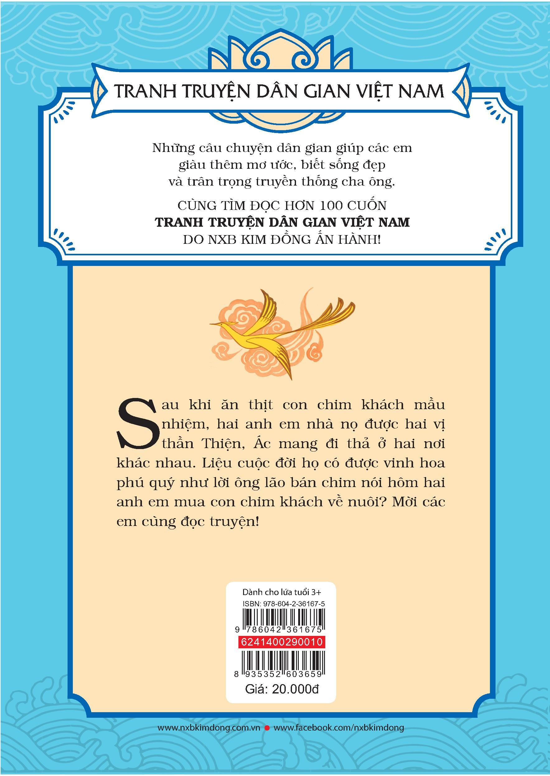Sau khi ăn thịt con chim khách mầu nhiệm, hai anh em nhà nọ được hai vị thần Thiện, Ác mang đi thả ở hai nơi khác nhau. Liệu cuộc đời họ có được vinh hoa phú quý như lời ông lão bán chim nói hôm hai anh em mua con chim khách về nuôi? Mời các em cùng đọc truyện nhé!