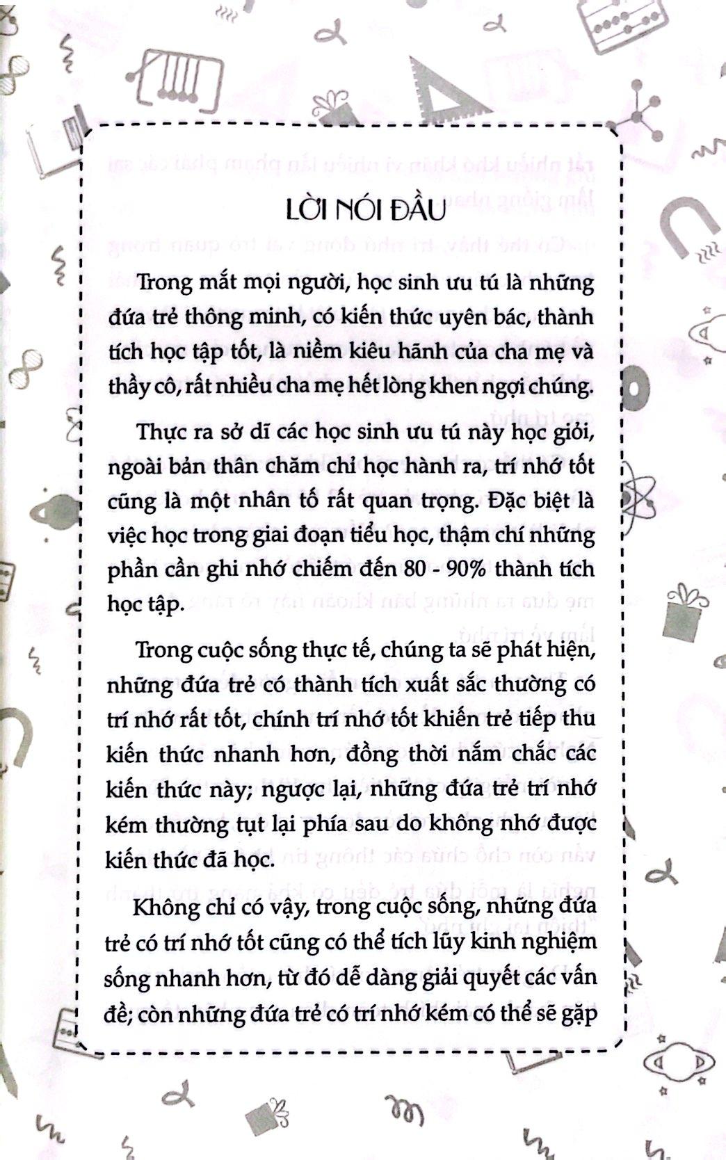 Đặc biệt cuốn sách còn cung cấp thêm 39 bài tập ghi nhớ và vai trò chơi rèn luyện trí nhớ ,để cho mẹ cùng tương tác với trẻ hy vọng cuốn sách này sẽ trở thành trợ thủ đắc lực của các bậc cha mẹ, người thầy người bạn tốt trên con đường trưởng thành của trẻ giúp trẻ khai thác tốt nhất .