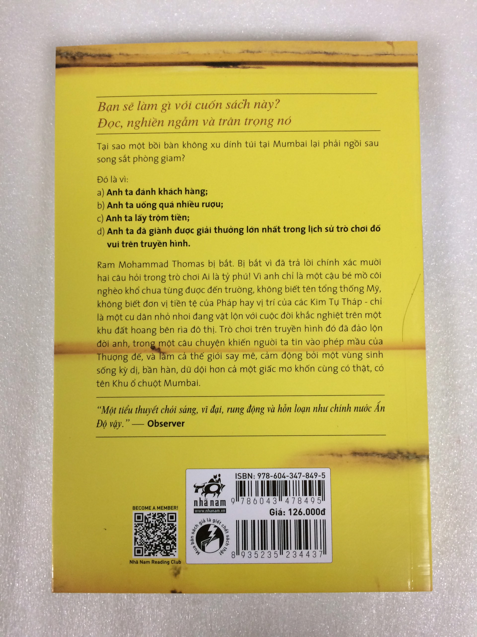Ram Mohammad Thomas đã bị bắt. Bị bắt vì đã trả lời chính xác mười hai câu hỏi trong trò chơi Ai là tỷ phú! Vì anh chỉ là một cậu bé mồ côi nghèo khổ chưa từng được đến trường, không biết tên tổng thống nước Mỹ, không biết đơn vị tiền tệ của Pháp hay vị trí của các Kim Tự Tháp… Vì anh chỉ là “một gã bồi bàn ngu xuẩn làm việc tại một nhà hàng tồi tàn”, một “đồ khốn vô tích sự” sống bên bờ của sự túng quẫn trên một khu đất hoang ở đô thị nơi người ta phải chen lấn từng phân và thậm chí đến đi ỉa cũng phải xếp hàng…