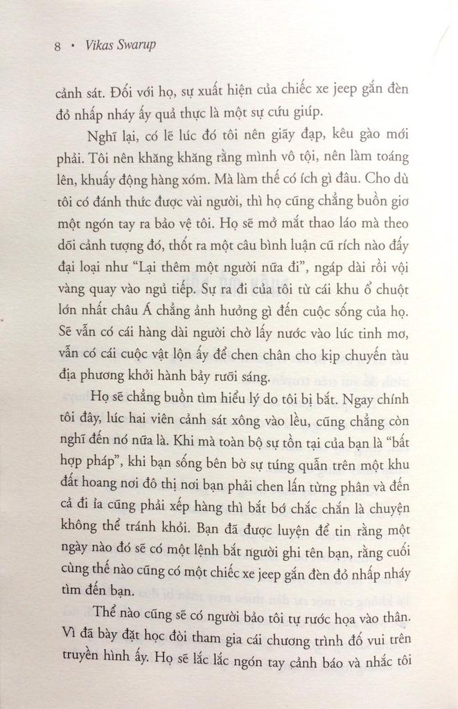 Ram Mohammad Thomas đã bị bắt. Bị bắt vì đã trả lời chính xác mười hai câu hỏi trong trò chơi Ai là tỷ phú! Vì anh chỉ là một cậu bé mồ côi nghèo khổ chưa từng được đến trường, không biết tên tổng thống nước Mỹ, không biết đơn vị tiền tệ của Pháp hay vị trí của các Kim Tự Tháp… Vì anh chỉ là “một gã bồi bàn ngu xuẩn làm việc tại một nhà hàng tồi tàn”, một “đồ khốn vô tích sự” sống bên bờ của sự túng quẫn trên một khu đất hoang ở đô thị nơi người ta phải chen lấn từng phân và thậm chí đến đi ỉa cũng phải xếp hàng…