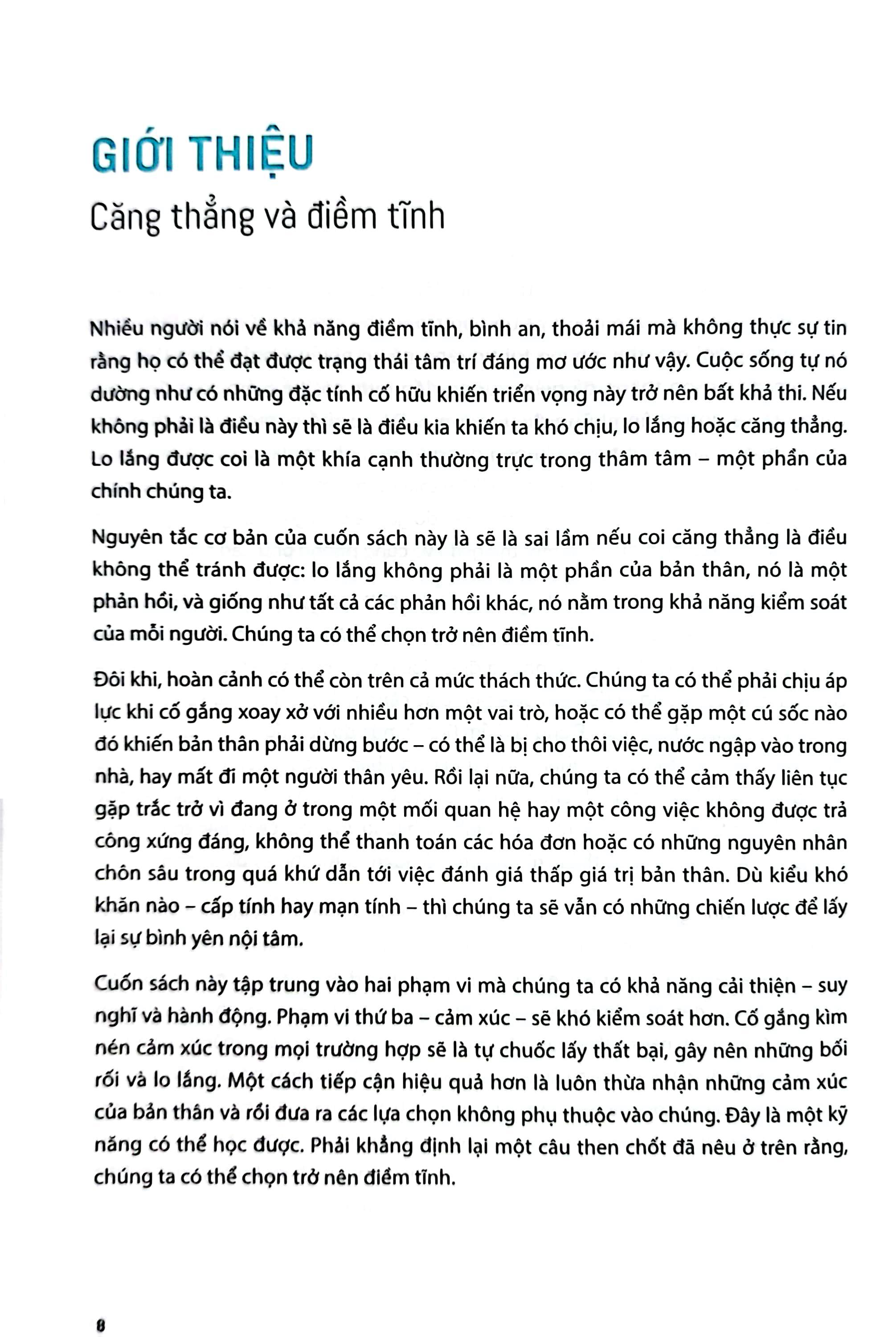Nguyên tắc cơ bản của cuốn sách này là sẽ là sai lầm nếu coi căng thẳng là điều không thể tránh được: lo lắng không phải là một phần của bản thân, nó là một phản hồi, và giống như tất cả các phản hồi khác, nó nằm trong khả năng kiểm soát của mỗi người. Chúng ta có thể chọn trở nên điềm tĩnh.