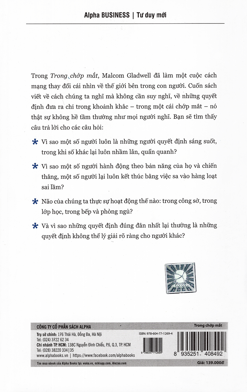 Trong Chớp Mắt là một cuốn sách chiến lược viết về sức mạnh của việc nghĩ mà không cần suy nghĩ, về những quyết định đưa ra chỉ trong một cái chớp mắt thực sự không hề tầm thường như mọi người vẫn ngh...