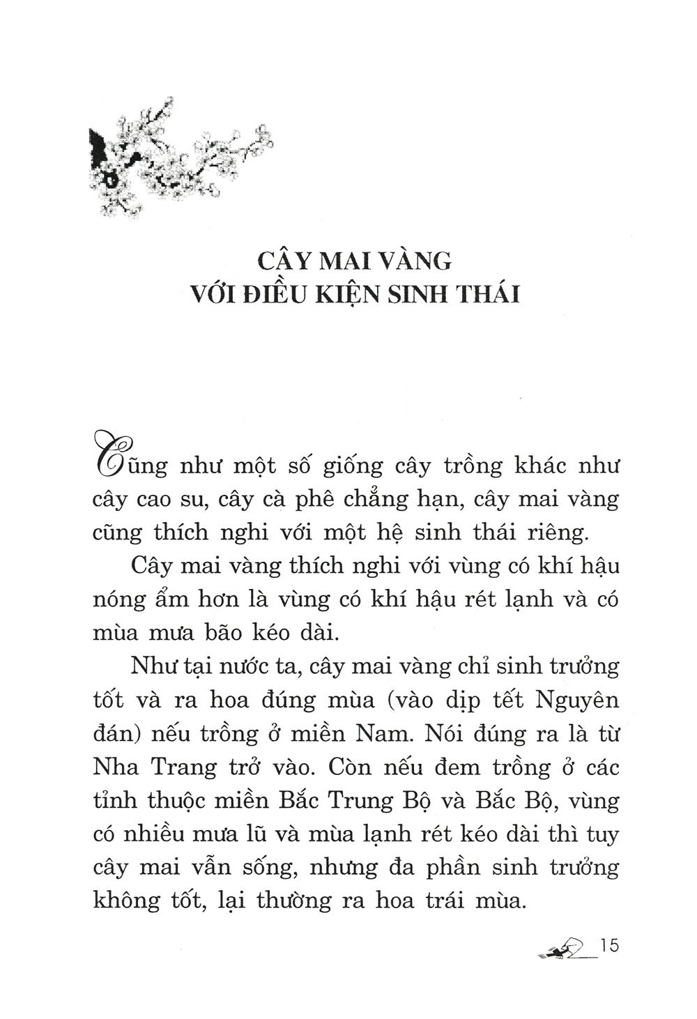 Muốn trồng được những cây mai đẹp đạt giá bán cao ngất ngưỡng như vậy, người làm vườn, tức là nghệ nhân hoa kiểng phải dày công chăm sóc tưới bón, và hằng ngày quan tâm đến việc phòng trị các loài sâu rầy và bệnh hại cho cây. Cuốn sách giới thiệu về kỹ thuật trồng, cách chăm sóc, tưới nước, phòng trừ côn trùng - bệnh hại cho cây mai.
