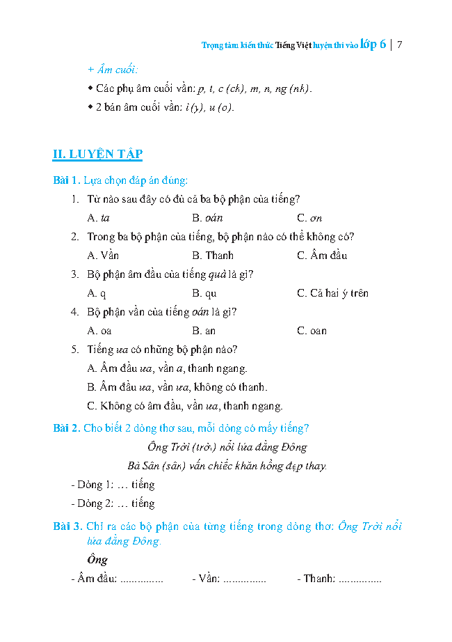 Hoàn thiện kiến thức môn tiếng Việt, rèn kỹ năng làm bài, làm quen với cấu trúc để thi, biết cách phân bổ thời gian hợp lý khi làm bà luôn luôn là nỗi lo của học sinh và phụ huynh khi các em bước vào kỳ thi chuyển cấp. Với kinh nghiệm nhiều năm trong nghề, nguyên Tổ trưởng Tổ Xã hội Trường THCS và THPT Việt Úc Hà Nội, nguyên giáo viên THPT Chuyên Ngoại ngữ Hà Nội, có Nguyễn Thị Thủy Anh đã viết ra bộ sách "Trọng tâm kiến thức tiếng Việt luyện thi vào lớp 6" gồm 2 tập, sẽ là tài liệu cực kỳ hữu ích, giúp các em học sinh đạt điểm 9, 10 trong kỳ thi vào lớp 6.
