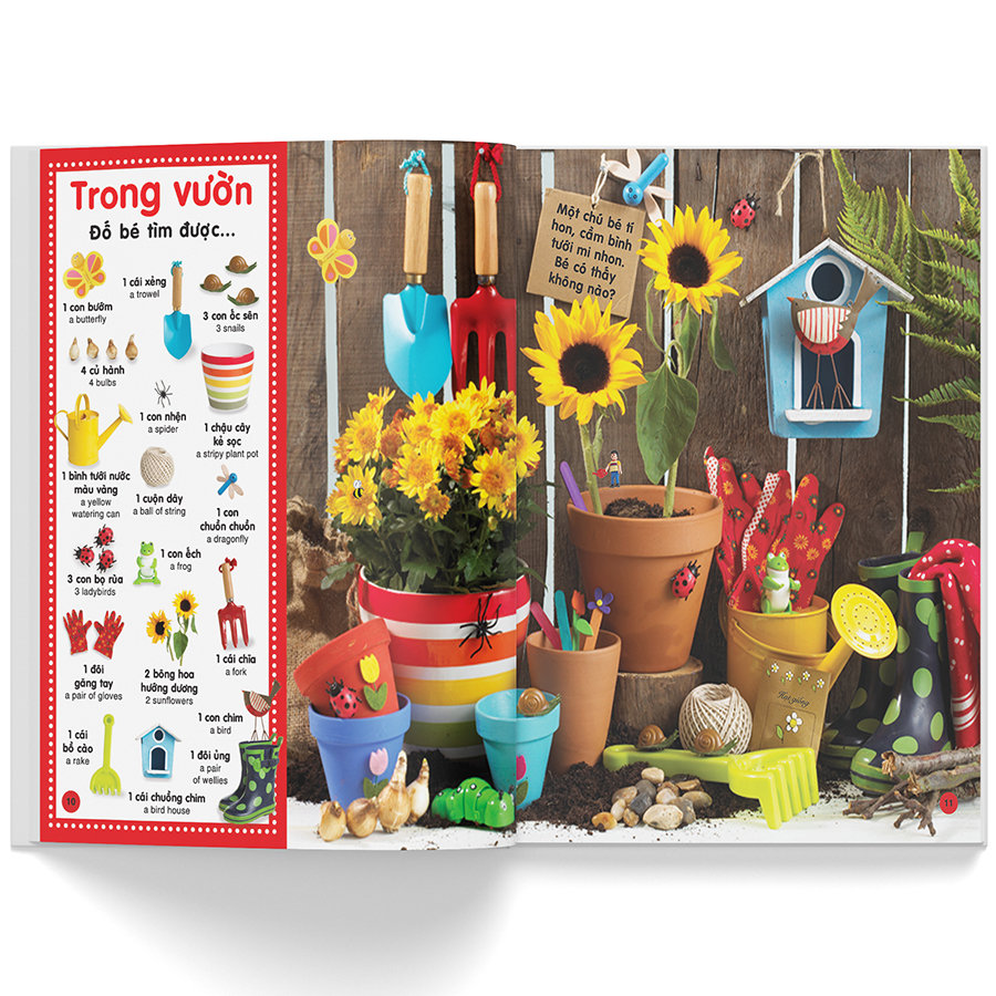 Trốn tìm – Những từ đầu tiên là cuốn sách tranh màu tuyệt vời dành cho các bậc phụ huynh cùng chia sẻ với con. Với những hình ảnh dễ thương về đồ vật giúp bé khám phá và học hỏi, cuốn sách này sẽ giúp bé xây dựng vốn từ vựng, học phân biệt màu sắc, luyện đếm số và phát triển kỹ năng quan sát. Các bé sẽ hào hứng làm quen với thế giới xung quanh qua việc tìm các đồ vật đã trốn kĩ trong tranh, từ đó dần nhận biết các đồ vật quen thuộc trong cuộc sống hàng ngày. Phương pháp giáo dục trực quan mới mẻ sẽ giúp trẻ ngày càng hào hứng, say mê tìm hiểu thế giới .
