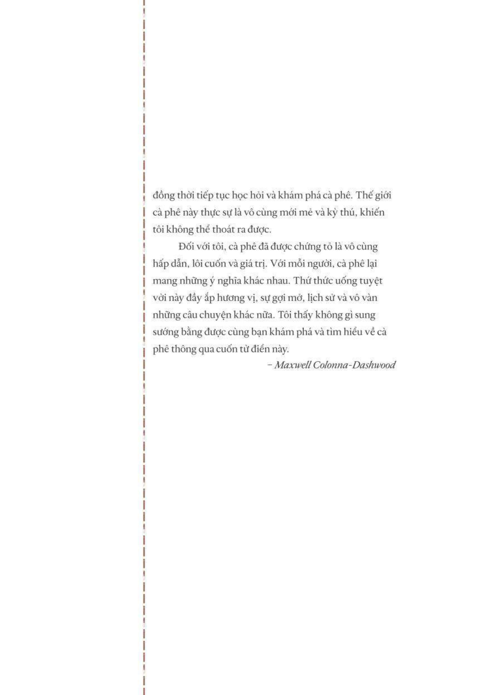 Phong trào cà phê đặc sản đã lan rộng khắp thế giới và Việt Nam cũng không ngoại lệ, số lượng các quán, các nhà rang cà phê đặc sản đã tăng lên đáng kể trong vài năm trở lại đây. Cùng với đó là nhu cầu tìm hiểu, khám phá các kiến thức về cà phê của những người yêu thích thứ đồ uống tuyệt vời này. Từ điển Cà phê chính là cẩm nang dành cho người yêu cà phê, giúp bạn giải mã các thuật ngữ, kỹ thuật, dụng cụ và các loại cà phê khác nhau để pha chế ra ly cà phê hoàn hảo của riêng m.ình.