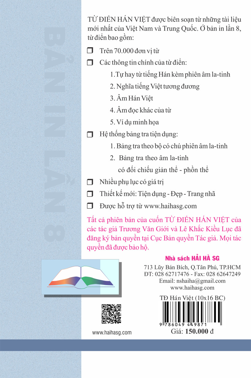 Khổ 10x16, bìa cứng, 1424 trang, in giấy trắng đẹp Nhằm đáp ứng nhu cầu tra cứu từ Việt sang Hán của người học tiếng Hán, nhất là để phục vụ cho đối tượng học