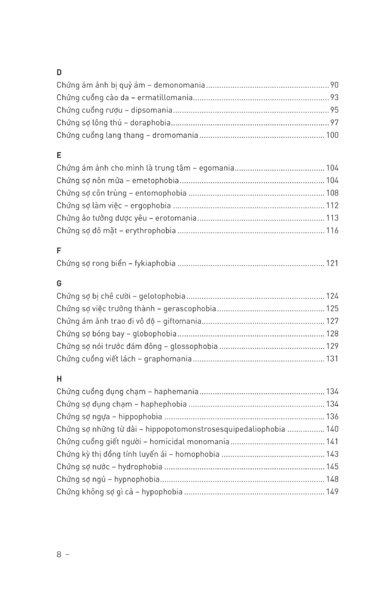 Cuốn sách bao gồm 99 nỗi ám ảnh sợ hãi (phobia) và cuồng loạn (mania) được sắp xếp theo thứ tự bảng chữ cái tên tiếng Anh từ Ablutophobia (chứng sợ sạch sẽ) đến Zoophobia (chứng sợ động vật), hoặc có thể chia thành các nhóm chủ đề như: cơ thể; tiếng ồn; bị cô lập; chạm vào…