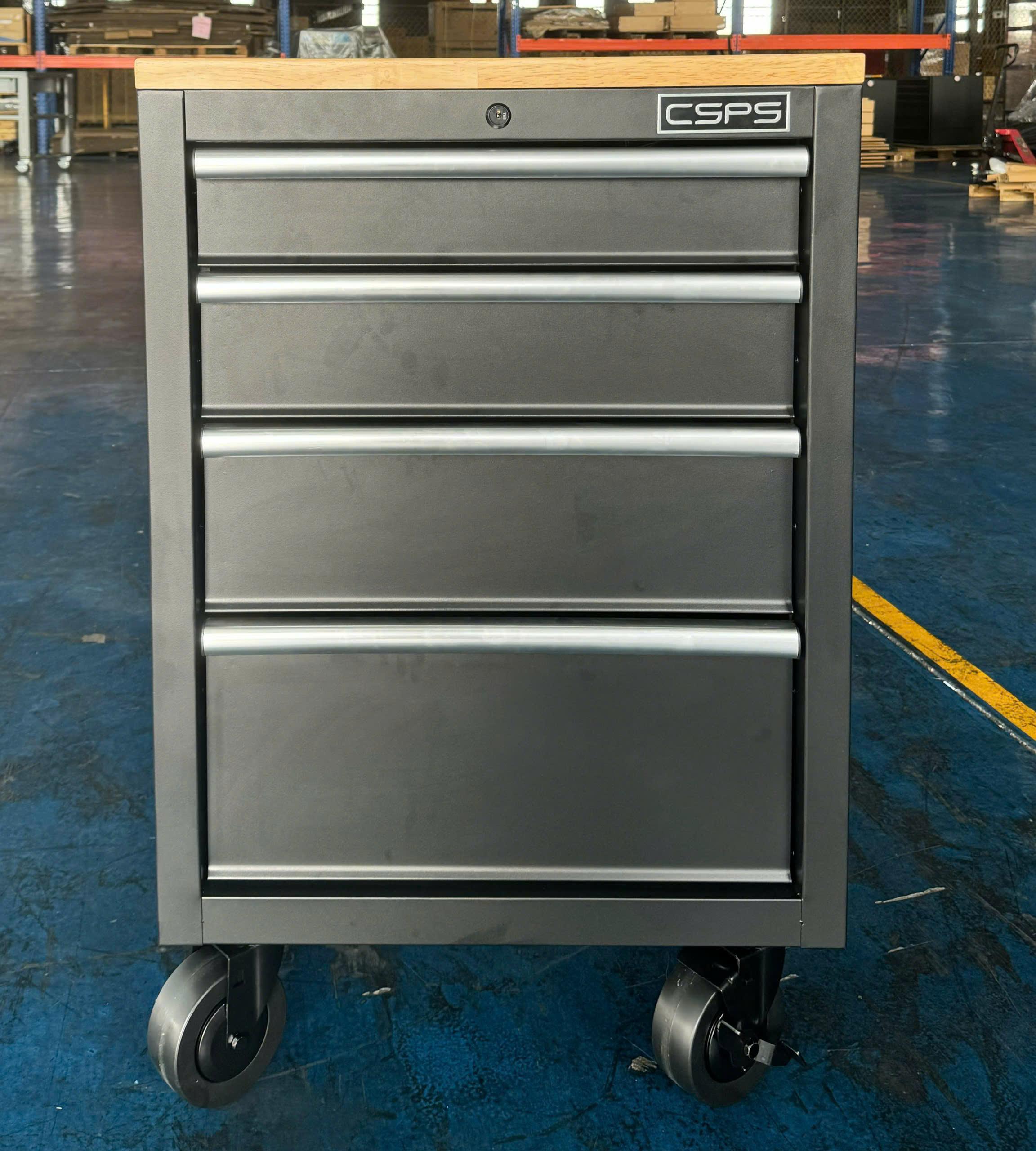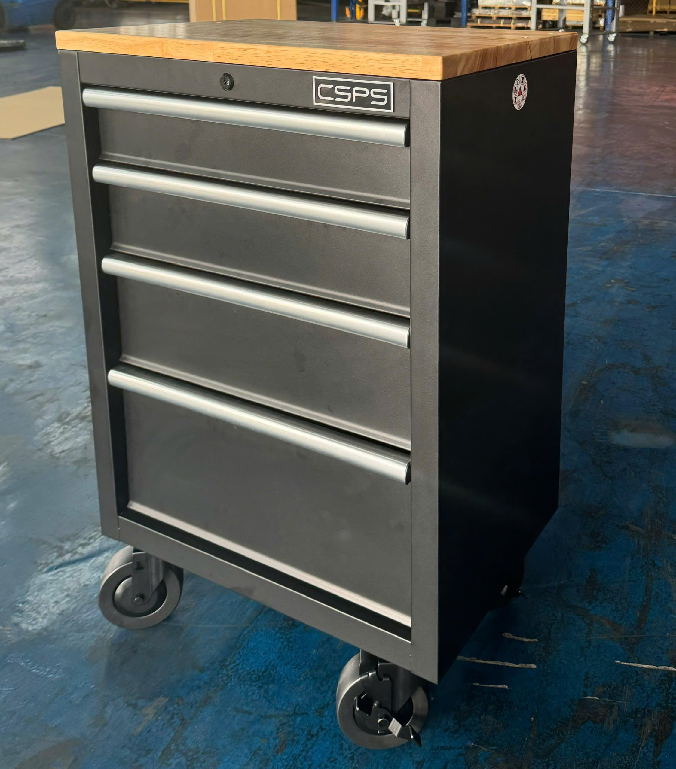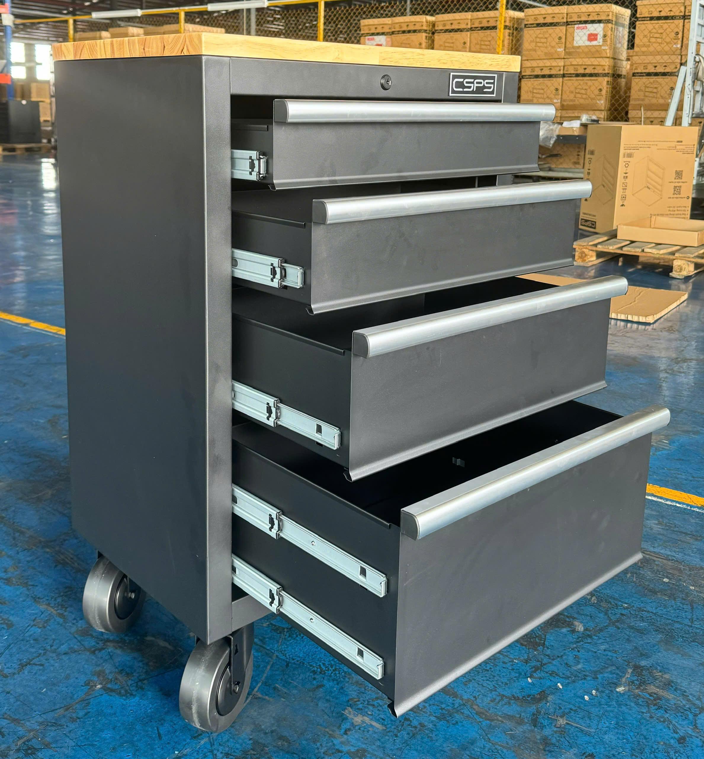 Tủ dụng cụ CSPS 61cm - 04 hộc kéo màu đen bánh xe ván gỗ (tay cầm trắng)