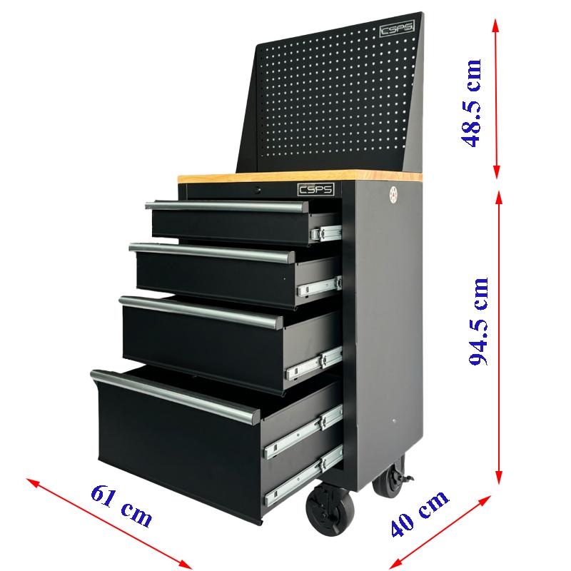 Tủ dụng cụ CSPS 61cm - 04 hộc kéo màu đen bánh xe ván gỗ vách lưới (tay cầm trắng)