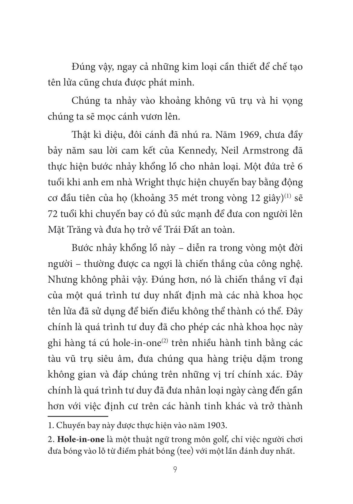 Tư duy như một nhà khoa học tên lửa là nhìn thế giới qua một lăng kính khác. Các nhà khoa học tên lửa hình dung ra những điều không tưởng và giải quyết những điều không thể giải quyết. Họ biến thất bại thành thành công và khó khăn thành lợi thế. Họi coi những rủi ro như những câu đố có thể giải được hơn là những rào cản không thể vượt qua. Họ hành động không phải bởi sự tin tưởng mù quáng mà bởi sự nghi ngờ chính bản thân; mục tiêu của họ không phải là kết quả trước mắt mà là đột phá lâu dài. Họ biết rằng các quy tắc không được thiết lập sẵn, điều mặc định có thể được thay đổi và một con đường mới có thể được tạo ra.