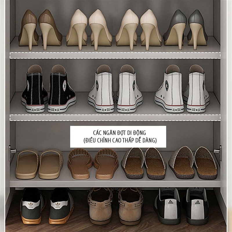 - Trong tủ sử dụng đợt di động, có thể dễ dàng điều chỉnh cao thấp dễ dàng trong quá trình lưu trữ: để giày dép, túi xách, mũ bảo hiểm,...