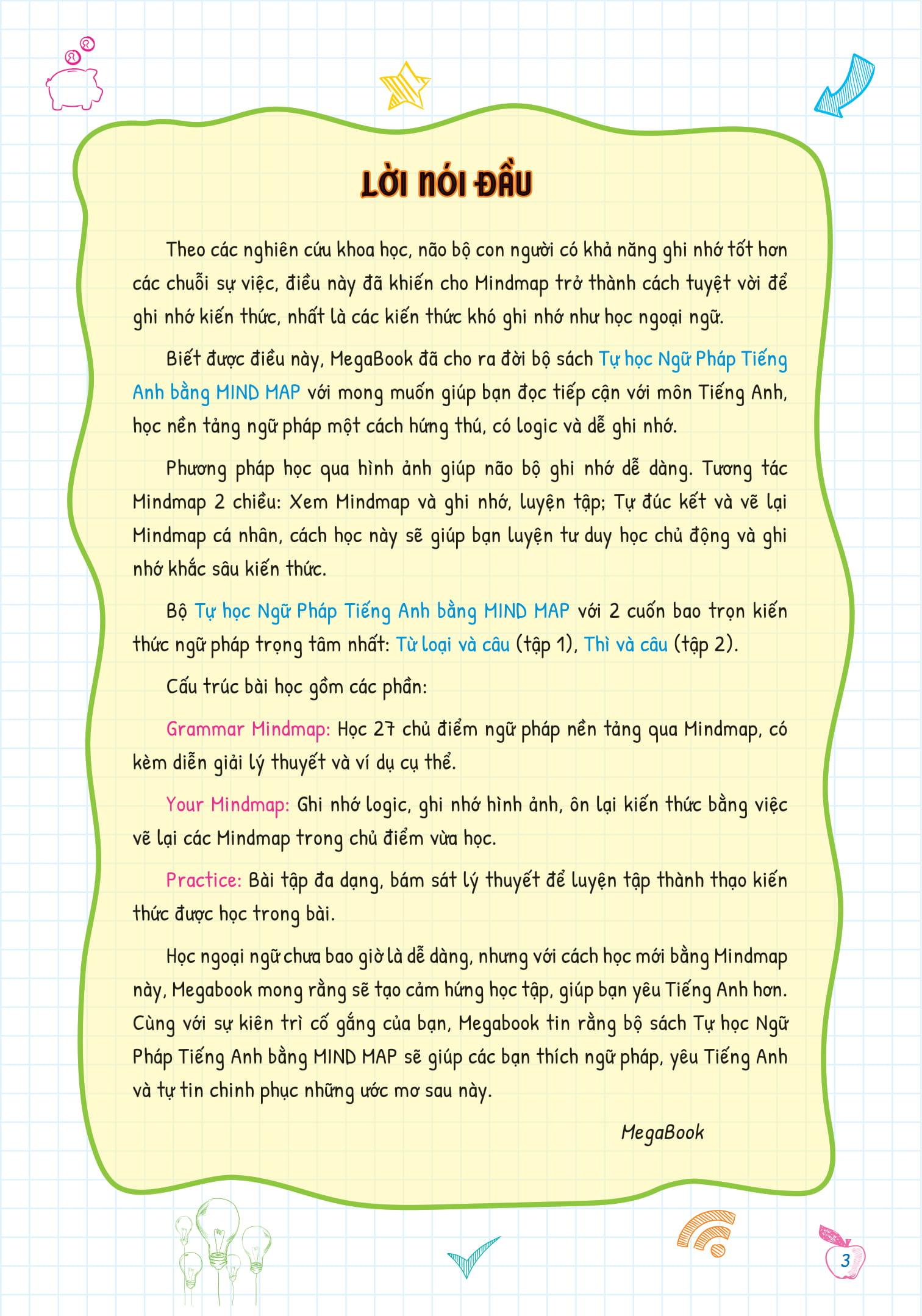 Học ngoại ngữ chưa bao giờ là dễ dàng, nhưng với cách học mới bằng Mindmap này, Megabook mong rằng sẽ tạo cảm hứng học tập, giúp bạn yêu Tiếng Anh hơn. Cùng với sự kiên trì cố gắng của bạn, Megabook tin rằng bộ sách Tự học Ngữ Pháp Tiếng Anh bằng MINDMAP sẽ giúp các bạn thích ngữ pháp, yêu Tiếng anh và tự tin chinh phục những ước mơ sau này.
