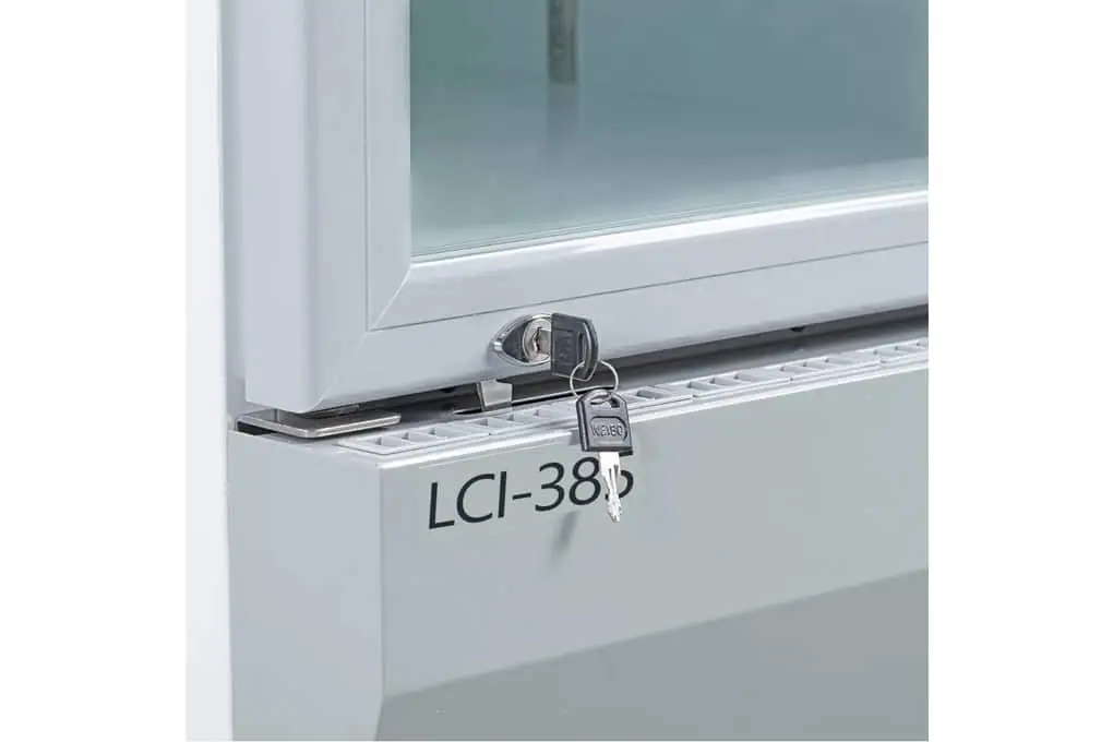 - LCI-385 là dạng tủ mát cỡ lớn, dung tích 450 lít có thiết kế 1 cửa mở ngang, công nghệ Inverter, kính 2 lớp hút chân không công nghệ low-e giúp giữ nhiệt tốt, có sấy kính.