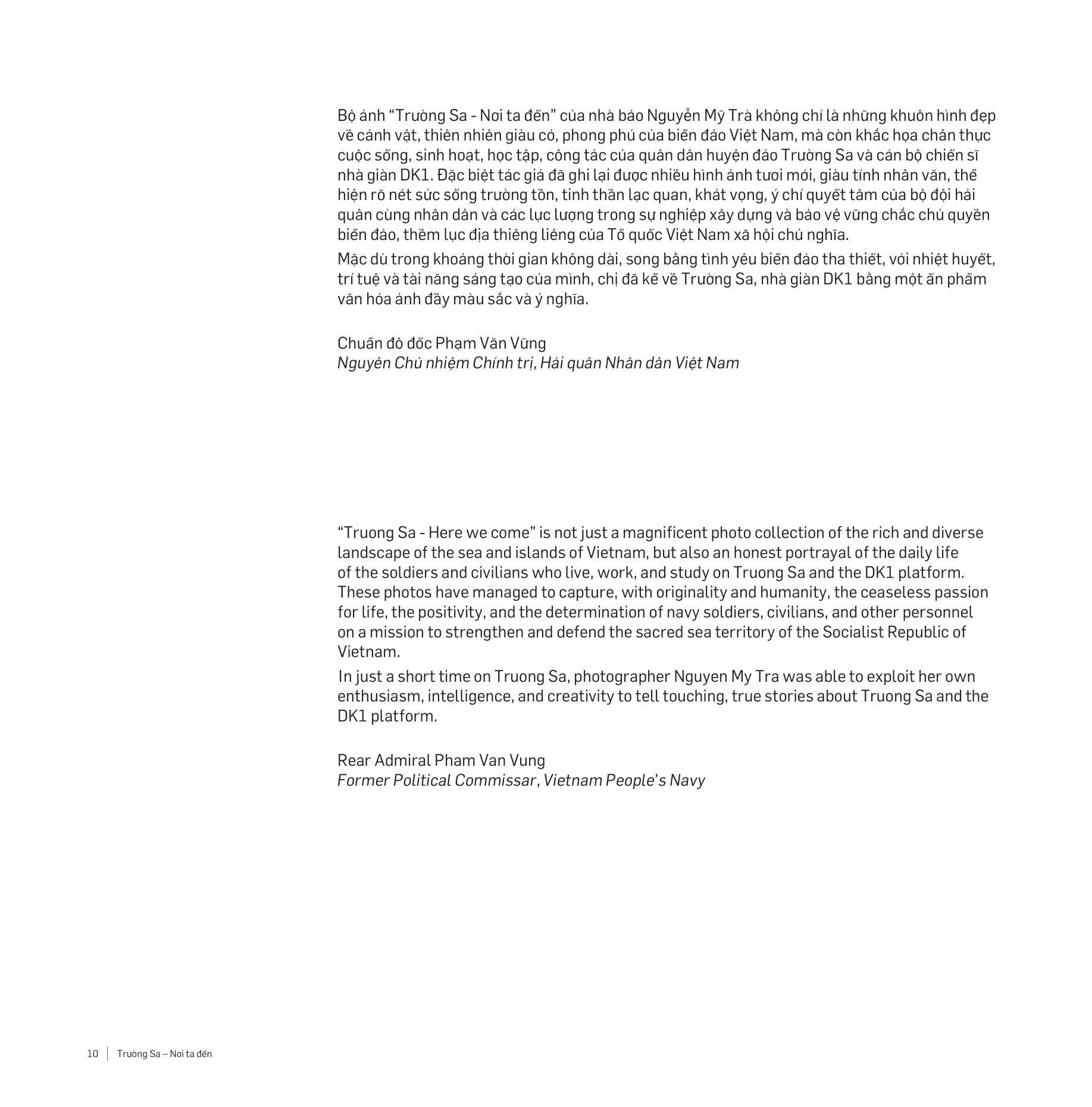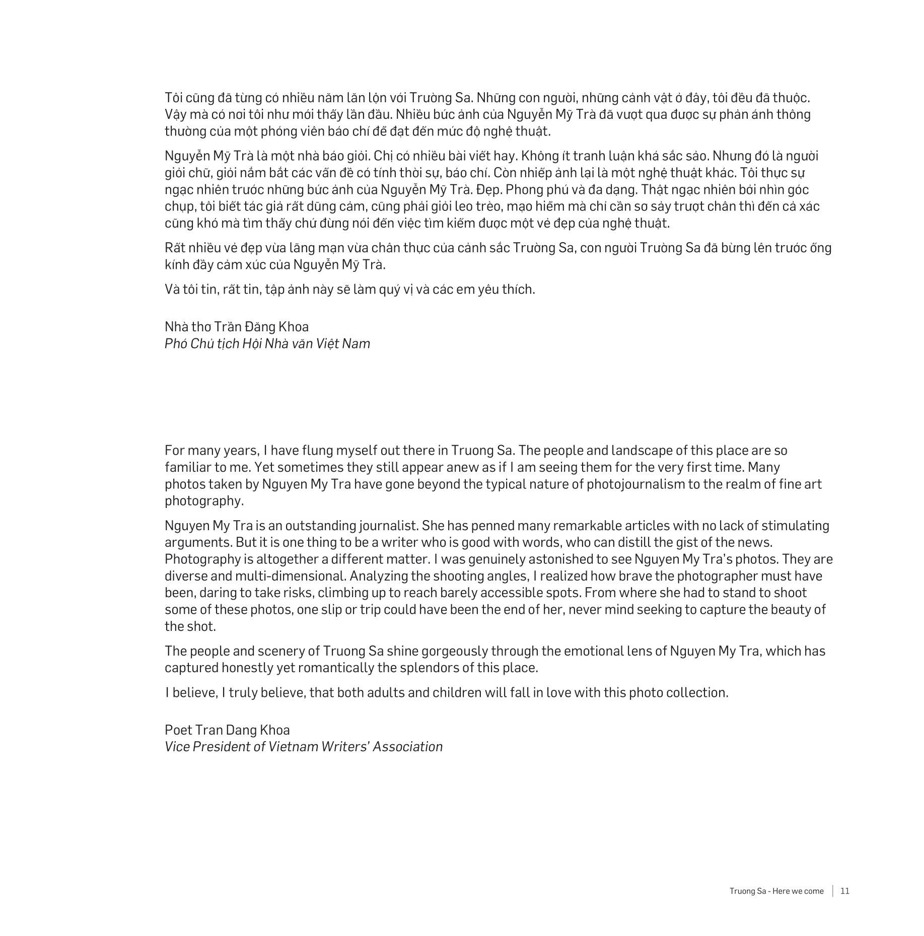 “To assert Vietnam’s sovereignty over Truong Sa (Spratly) islands, generations after generations of Vietnamese civilians and armed forces have erected various posts from iron, steel, concrete as well as other materials. There are, however, much more resilient sovereignty markers that neither wave nor storm could weather. They exist in the sacrifices of countless navy soldiers, in music, literature, artistic photos, etc. “Truong Sa - Here we come”, the book by journalist Nguyễn Mỹ Trà you are holding, can also be considered a valuable declaration of the country’s indisputable rights over its sacred territorial waters and maritime features.” - Tran Dang Khoa, poet.