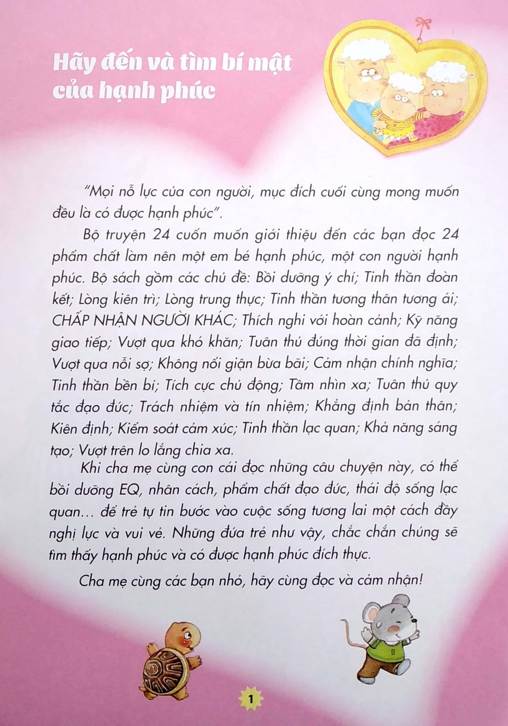 Mua tại TiktokBộ truyện Tủ sách rèn nhân cách sống cho trẻ xoay quanh cuộc sống của các bạn động vật đáng yêu được nhân hóa. Khi cha mẹ cùng con cái đọc những câu chuyện này, có thể bồi dưỡng EQ, nhân cách, phẩm chất đạo đức, thái độ sống lạc quan… để trẻ tự tin bước vào cuộc sống tương lai một cách đầy nghị lực và vui vẻ. Những đứa trẻ như vậy, chắc chắc chúng sẽ tìm thấy hạnh phúc và có được hạnh phúc đích thực.
