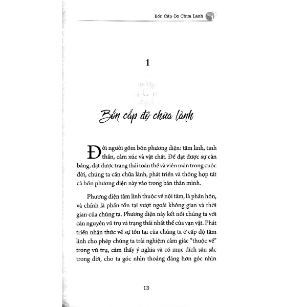 Trong cuốn sách này, Shakti Gawain phát biểu rằng, con người là một tổng thể gồm bốn chiều kích: tâm linh, tinh thần, cảm xúc, thể chất; và con người chỉ có thể sống hạnh phúc và viên mãn khi cả bốn khía cạnh này đều được chữa lành, duy trì và cân bằng. Tổn thương có thể tồn tại dưới nhiều hình thức ở mỗi cấp độ, nhưng với các bài hướng dẫn sâu sắc mà chính Gawain đã tự mình trải nghiệm, bạn chắc chắn sẽ tìm được cách chữa lành tốt nhất cho từng cấp độ tồn tại của mình.