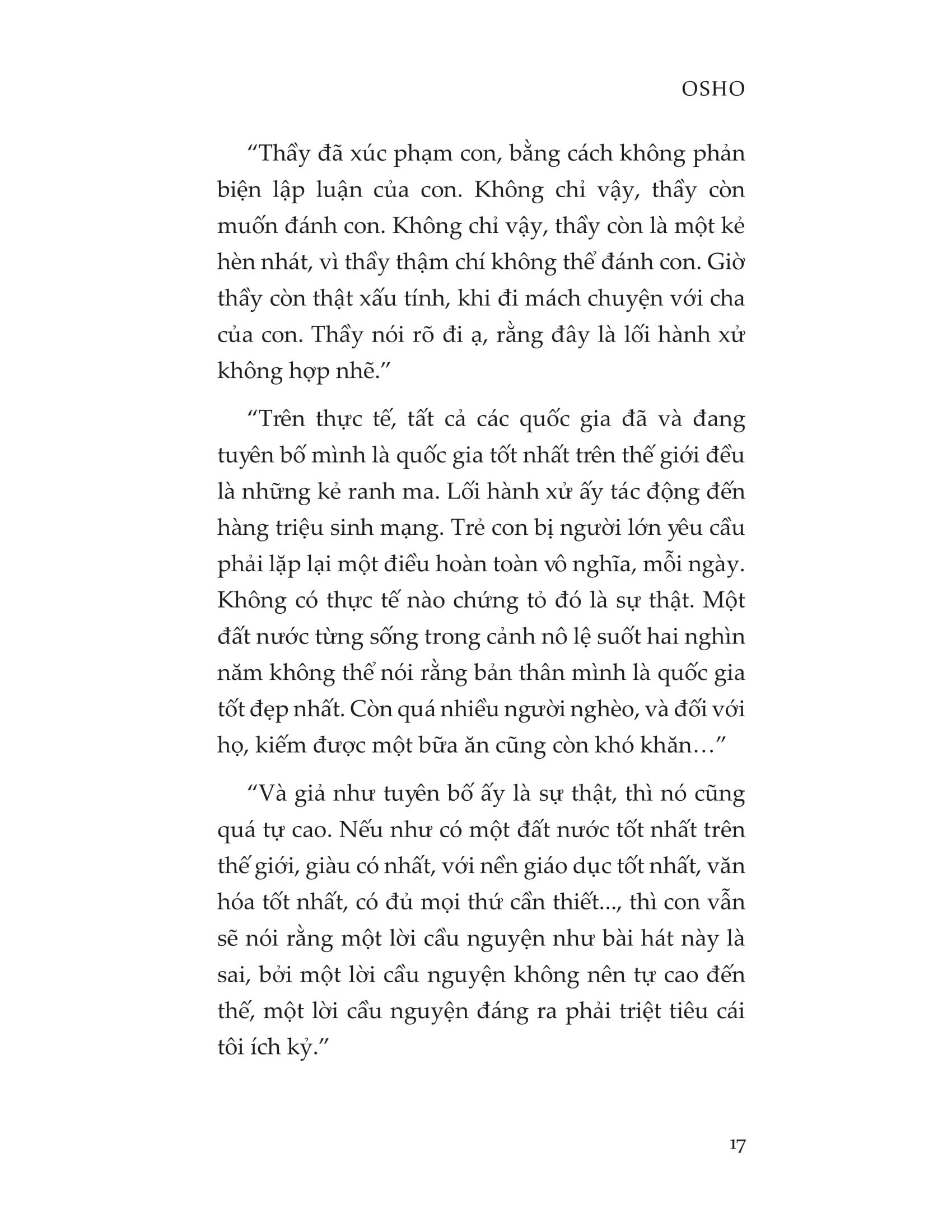 Trong cuốn sách này, Osho giúp chúng ta định nghĩa lại con người mình. Đối với hầu hết mọi người, từ khi ta đủ lớn để biết đi, nhiều bài giảng tôn giáo và đạo đức đã được sử dụng để định hình hành vi của chúng ta - một con người nhỏ bé trong thế giới của rất nhiều con người khác. Osho nói rằng, nếu như chúng ta còn mang gánh nặng của những quan điểm và những điều mê tín dị đoan bị áp đặt lên bản thân này, thì ta thậm chí không thể bắt đầu một cuộc tìm kiếm trung thực để khám phá xem ta thực sự là ai. Một khi ta còn chưa biết mình là ai, sự tự tôn mà ta đang có hiện nay sẽ chỉ là một thứ được xây trên nền móng thiếu vững chắc, dễ dàng đổ sụp ngay vào khoảnh khắc một niềm tin nào đó mà chúng ta trân quý bị đặt dấu hỏi.