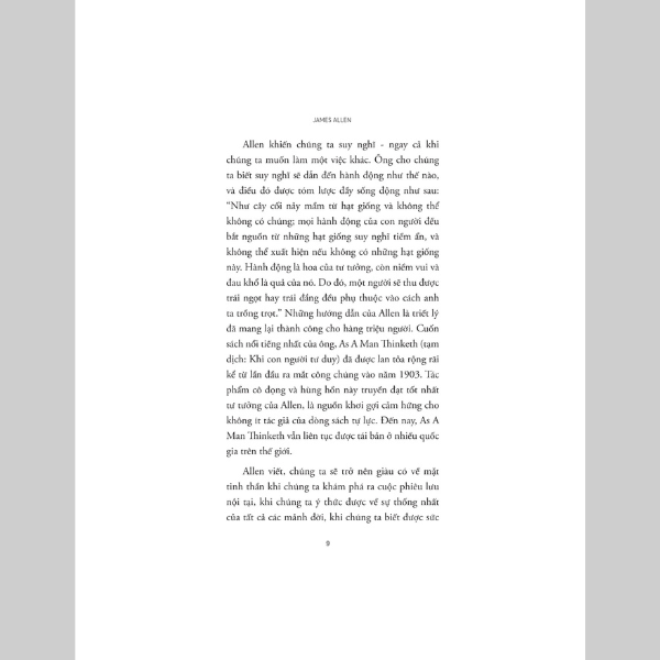 James Allen (1864 – 1912) là một người bí ẩn trong giới sách vở, nhưng những bài viết đầy cảm hứng của ông đã tác động đến hàng triệu người. Những chiêm nghiệm sâu sắc của ông về nội tâm con người - cụ thể là cách con người suy nghĩ, cảm nhận và tu dưỡng đạo đức - vẫn còn nguyên giá trị và thường xuyên được trích dẫn lại, ngay cả khi những cuốn sách ông viết đã được xuất bản cách đây hơn một trăm năm, trong những năm đầu tiên của thế kỷ 20.