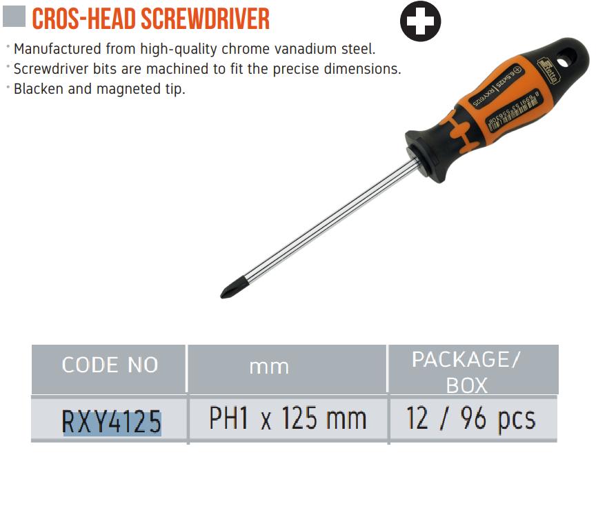 Tua vít 4 cạnh PH2 x 125mm Retta RXY6125 Thổ Nhĩ Kỳ Model:RXY6125 Chiều dài:125mm Là dụng cụ cầm tay, chuyên dùng để vặn, siết đóng ốc vít bằng tay. Sản phẩm được gia công rất