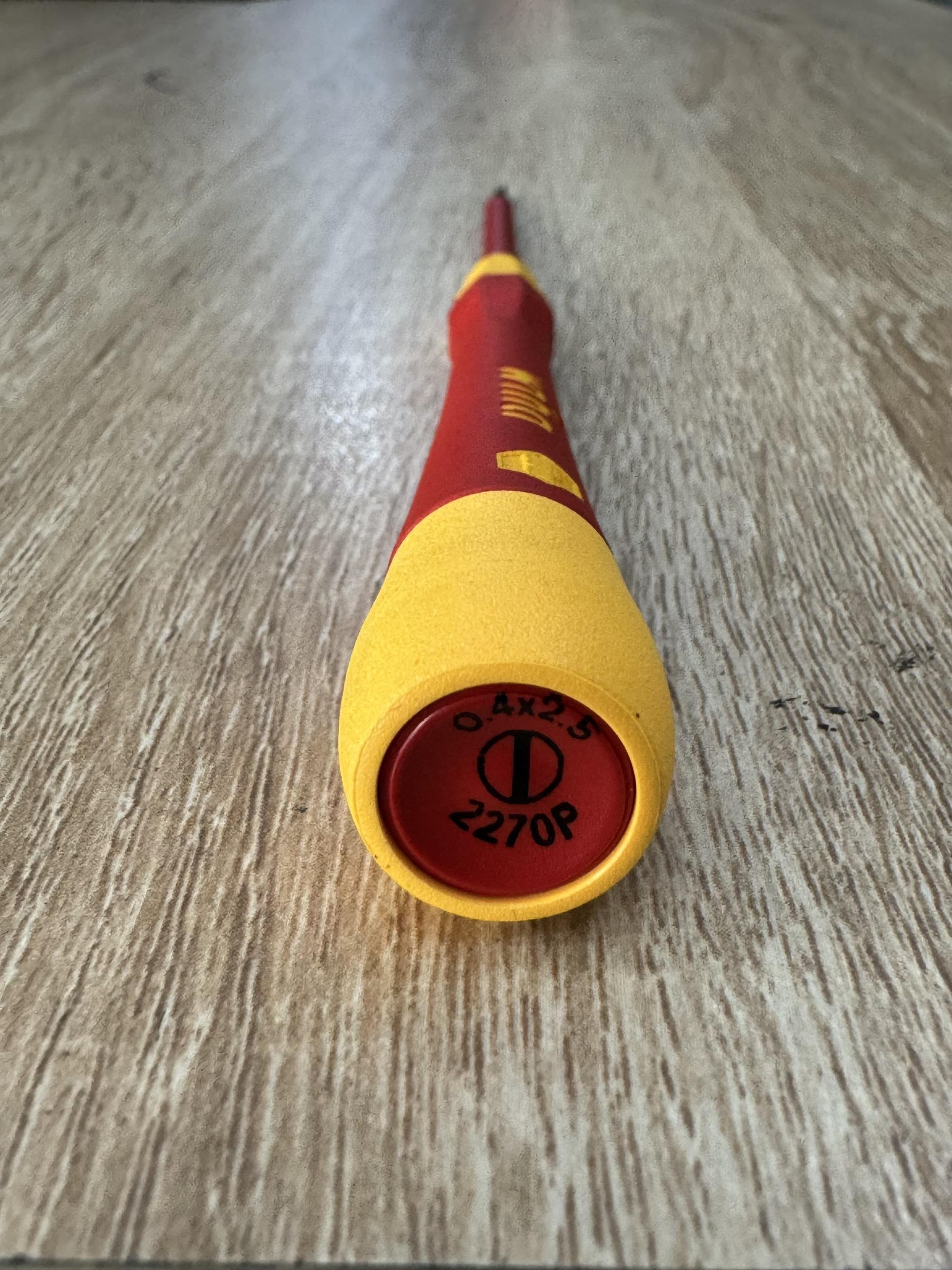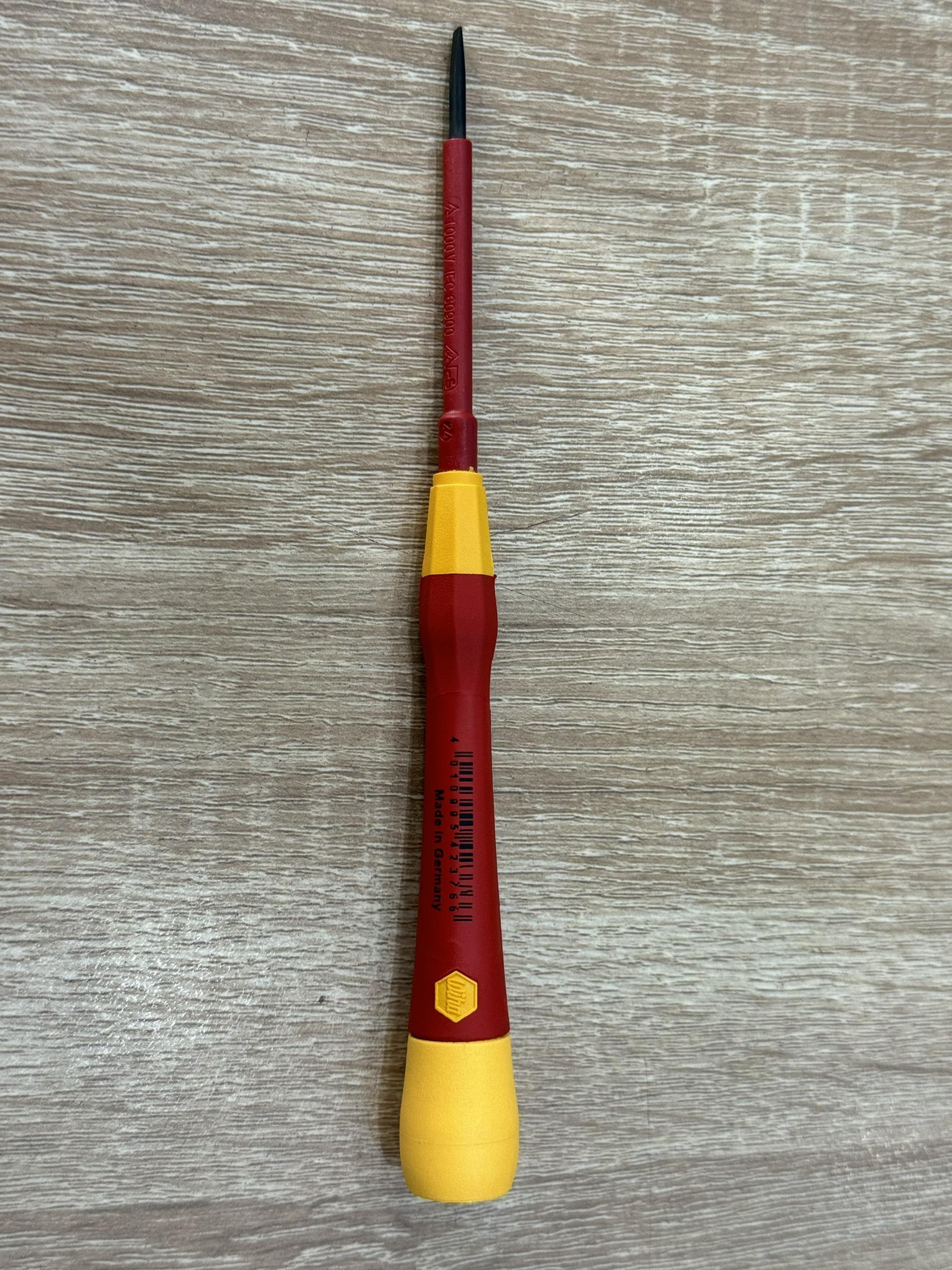 English name:Screwdriver SoftFinish electric Tiêu chuẩnĐược thử nghiệm theo IEC 60900.Ứng dụng Đối với công việc trong khu vực của các bộ phận sống lên đến 1.000 V AC. Size: 2,5 mm Chiều dài: 179