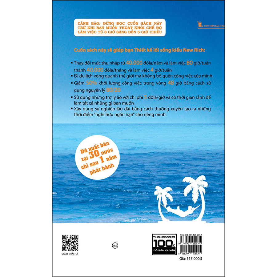 Trong cuốn sách này, Tim sẽ chỉ cho chúng ta thấy Làm thế nào để có được lối sống hoàn toàn tự do của một triệu phú mà không cần phải có 1 triệu đô la? Chỉ có một câu trả lời đơn giản, anh đã biết tách biệt thu nhập với thời gian và tạo ra lối sống lý tưởng cho mình, đi du lịch vòng quanh thế giới và tận hưởng những điều thú vị nhất trên hành tinh này. Và Tim còn chỉ cho bạn anh đã làm như thế nào để từ làm việc 14 giờ/ngày và kiếm 40.000 đô-la/ năm thành làm việc 4 giờ/ tuần và kiếm 40.000 đô la/ tháng?