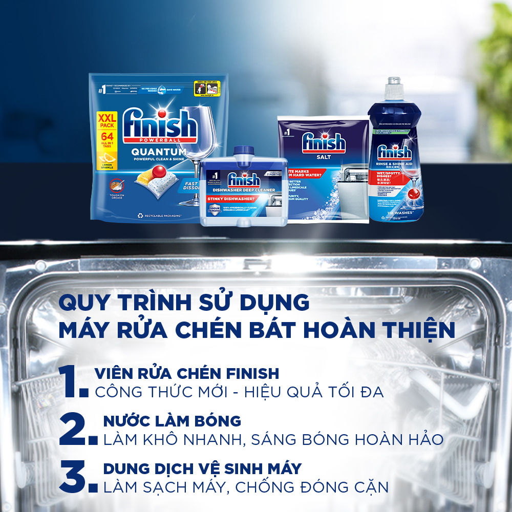 Finish -Thương hiệu số 1 toàn cầu, dẫn đầu thị trường về rửa chén tự động, được khuyên dùng bởi Bosch, LG, Samsung.