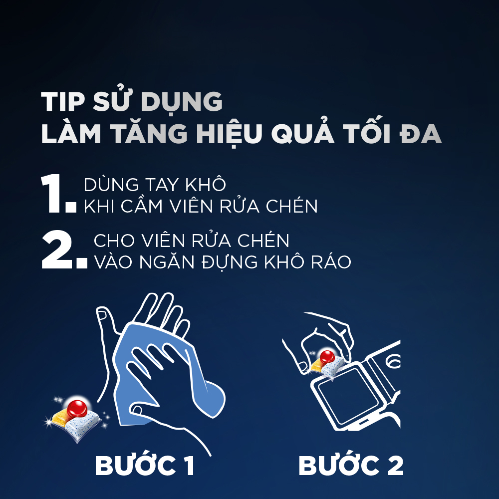 Viên rửa bát mạnh mẽ với khả năng hòa tan dầu mỡ chống lại hầu hết các vết dầu mỡ cứng đầu Là dạng viên rửa bát tổng hợp cả muối và nước làm bóng