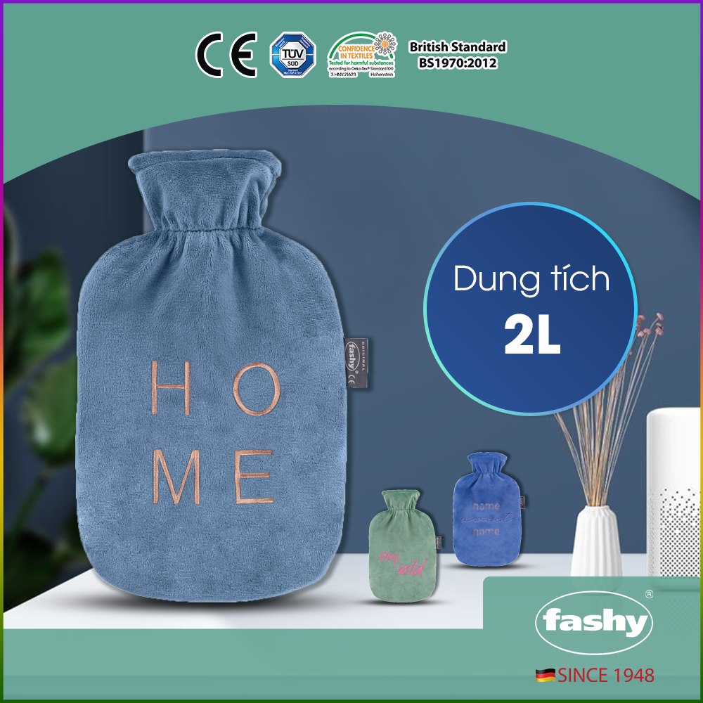 - Vỏ bọc: Vải dệt nhung chất liệu 100% polyester hoạ tiết "Home", "Home Sweet Home", "Stay Wild" – Nắp dạng xoắn chống rò rỉ cao – Túi chườm nóng Fashy bọc len chịu được nhiệt độ từ -20 độ C đến 90 độ C CÔNG DỤNG: