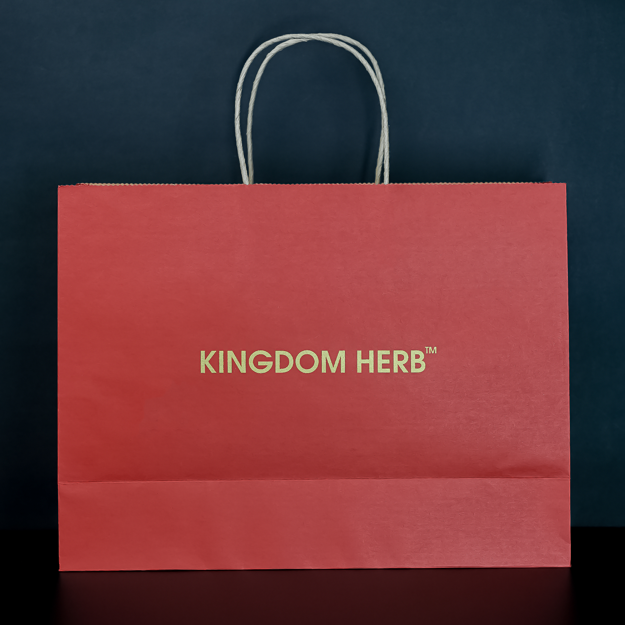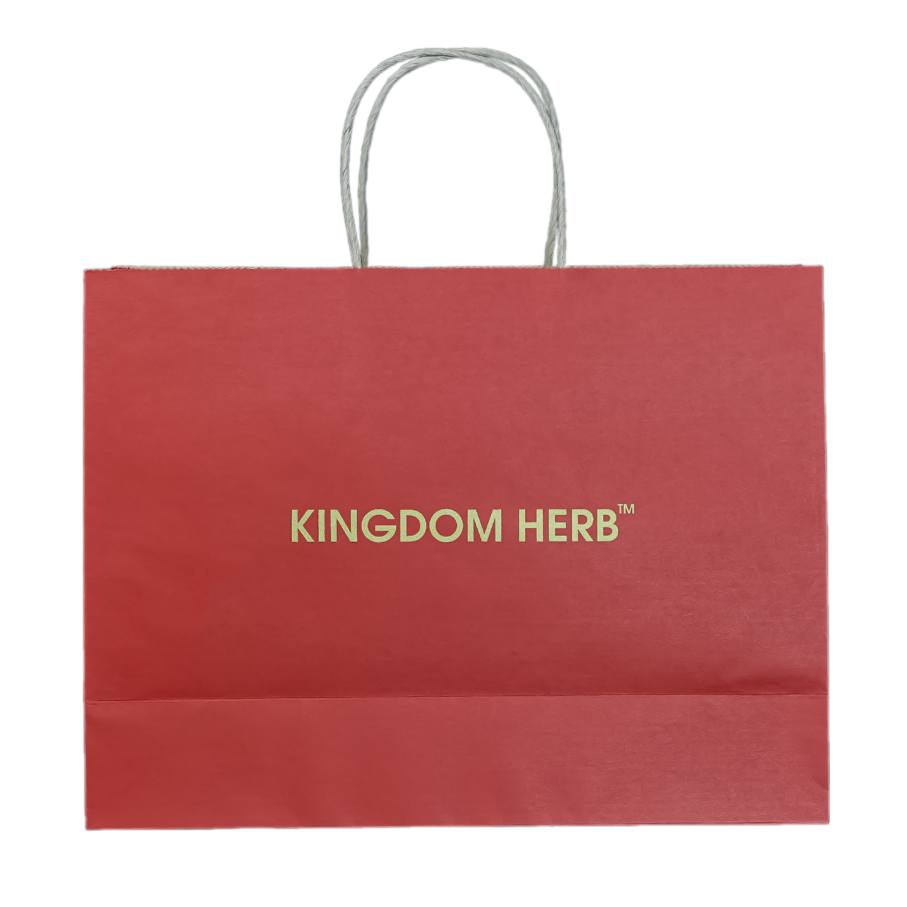 Thông tin về sản phẩm: TÚI GIẤY KRAFT THƯƠNG HIỆU KINGDOM HERB - Màu sắc: đỏ - Chất liệu: Giấy kraft định lượng 120gsm - Tải trọng: 4-6kg - Thân thiện với môi trường KÍCH