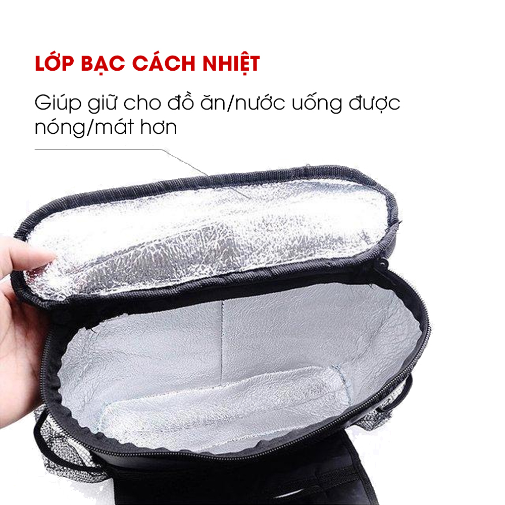 hiết kế gồm 1 ngăn chính, 3 ngăn phụ và 1 ngăn đựng giấy ăn. Bên trong ngăn chính của túi đựng đồ sau ghế ô tô là lớp cách nhiệt chuyên dụng, giữ cho đồ ăn được nóng, đồ uống được mát hơn khi không sử dụng.