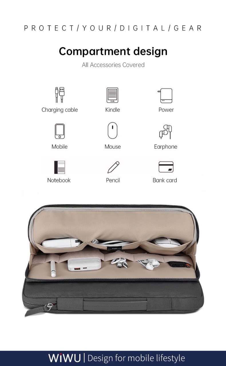 THÔNG TIN CƠ BẢN - Thương hiệu: WiWU - Model: Minimalist Laptop Bag II - Năm sản xuất: 2024 - Loại túi: Túi đựng Laptop & phụ kiện dạng ngang, có quai đeo chéo CHI TIẾT