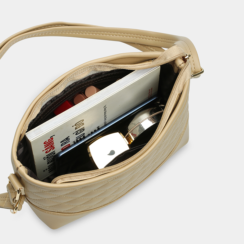 Bên trong túi có 1 ngăn chính rộng rãi thích hợp đựng máy tính bảng từ 7.9 inch trở xuống, sạc dự phòng, sổ tay nhỏ, ví tiền, mỹ phẩm nhỏ gọn…Ngoài ra bên trong túi còn có 1 ngăn kéo nhỏ đựng các loại giấy tờ tuỳ thân, tai nghe…Thêm nữa túi có 1 ngăn phụ nhỏ đựng được chìa khoá, thẻ xe rất thích hợp sử dụng để đi làm, đi chơi, hay dạo phố.