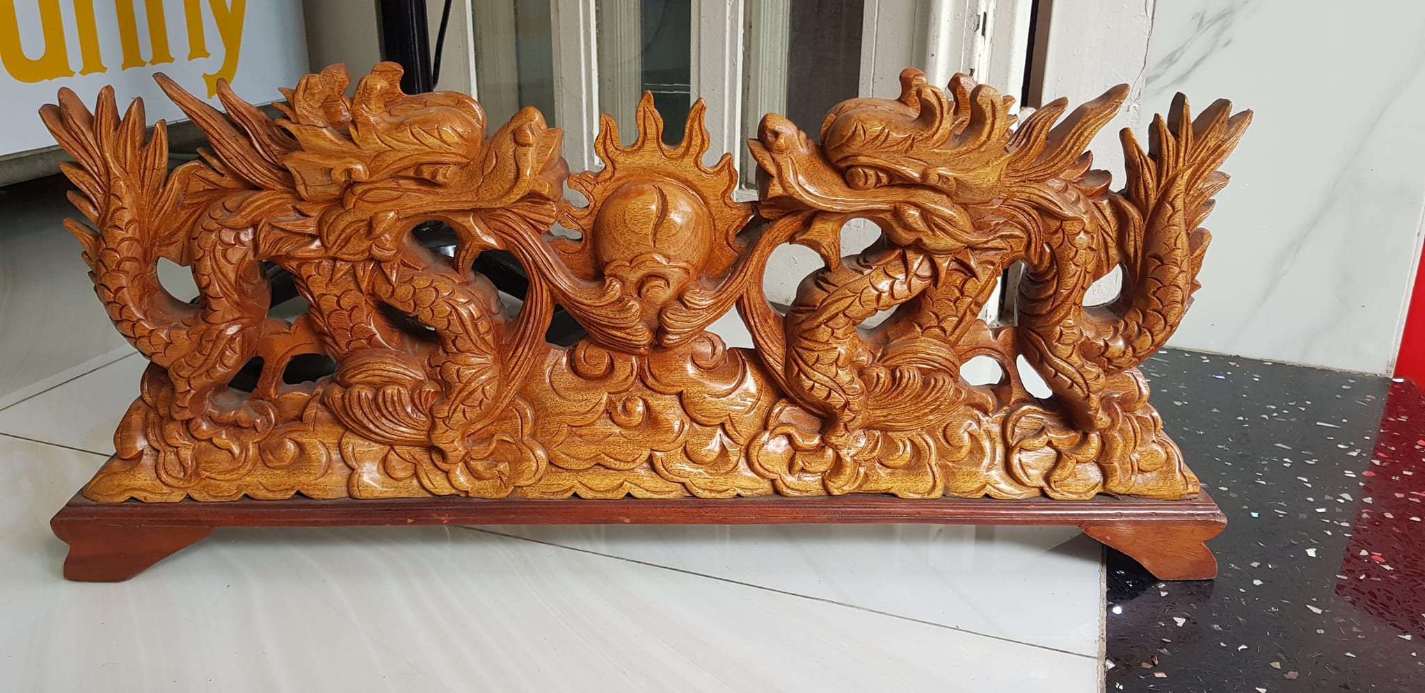 Tượng Song Long lượn Gỗ Gõ màu đỏ Dài 64cm x Cao 17cm x Sâu 7cm 2 con rồng biểu tượng cho sức mạnh