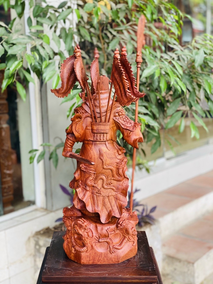 _ Tượng quan công cầm đao sau nưng cắm những lá cờ .Được trạm khắc vô cùng tỉ mỉ ,tinh sảo kỳ công .Đi hầu hết tất cả mọi chi tiết góc ngách nội dung hoa văn của tượng đều được gọt tỉa ,chỉnh sửa sắc nét hoàn toàn bằng tay thủ công .Đồng thời tượng được kiểm định kỹ lưỡng khắt khe ,như cho vào thẩm sấy cho gỗ khô kiệt .Mục đích trống dập nứt vênh mo mối mọt .Kết hợp với trà nhám ,đánh giấy giáp nhiều nước sờ mát lạnh .Song rồi cho vào phun lót làm bóng mờ để giữ lại mầu sắc vân gỗ tự nhiên .Tượng được làm và hoàn thiện do bàn tay khối óc tài hoa .Từ những người thợ dầy rặn kinh nghiệm cũng như tay nghề cao trong làng nghề truyền thống .Chính vì thế tượng quan công đã đáp ứng đầy đủ mọi tiêu trí ( Đẹp bền rẻ ) Thẩm mỹ nghệ thuật với chất lượng tuyệt vời