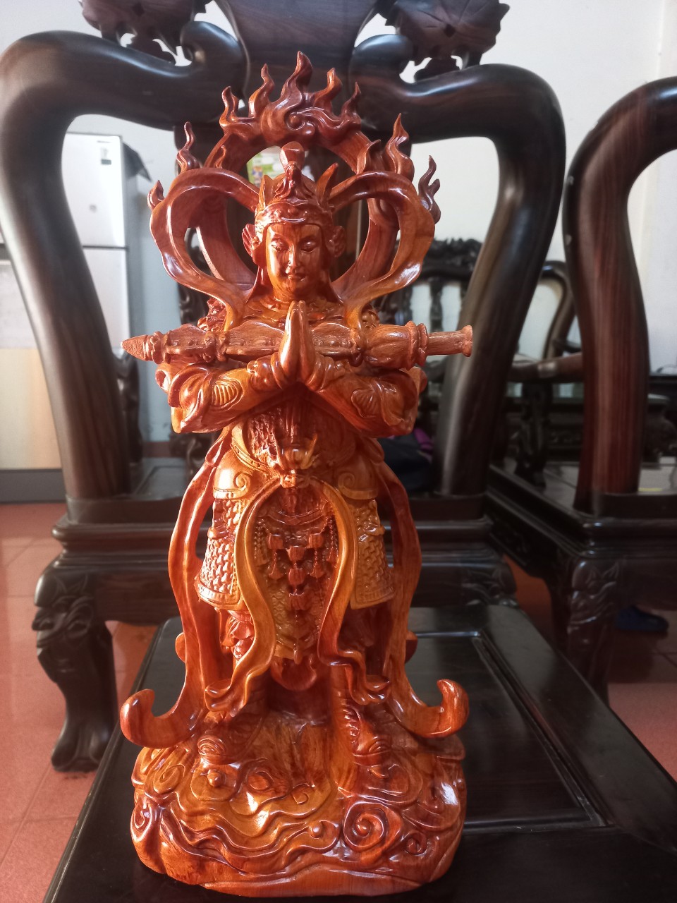 _ Tượng được chạm khắc vô cùng tỉ mỉ ,tinh xảo kỳ công .Đi hầu hết tất cả mọi chi tiết góc ngách nội dung hoa văn của tượng đều được gọt tỉa chỉnh sửa sắc nét hoàn toàn bằng tay thủ công .Đồng thời tượng được kiểm định kỹ lưỡng khắt khe ,như cho vào thẩm sấy cho gỗ khô kiệt .Mục đích chống dâp nứt vênh mo mối mọt .Kết hợp với trà nhám đánh giấy giáp nhiều nước sờ mát lạnh .Song cho vào phun lót làm bóng mờ để giữ lại mầu sắc vân gỗ tự nhiên .Tượng được làm và hoàn thiện do bàn tay khối óc tài hoa .Từ những người thợ giàu kinh nghiệm cũng như tay nghề cao trong làng nghề truyền thống .