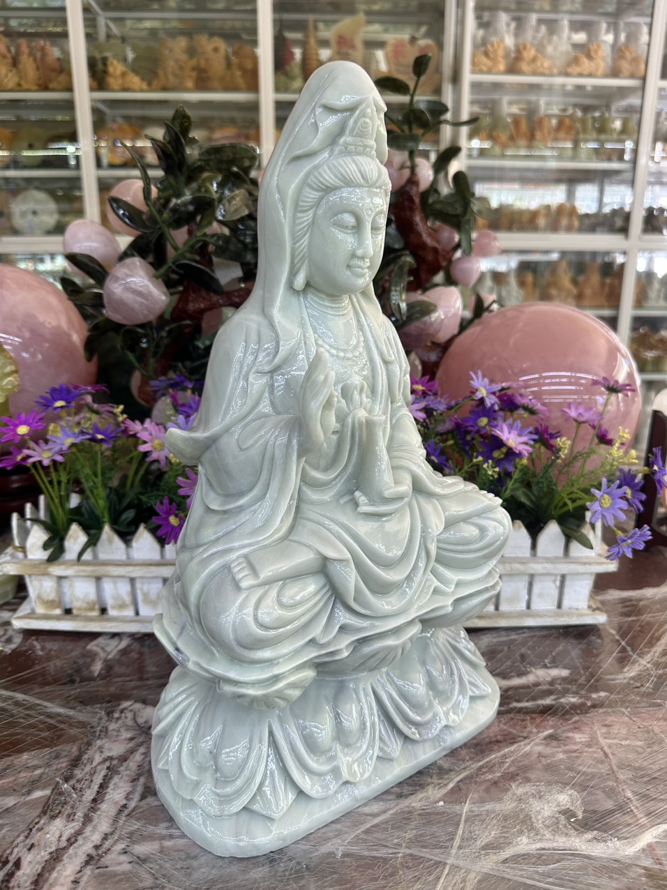 ✨Tượng Phật Bà Quan Thế Âm Bồ Tát ngồi đài sen cầu bình an đá cẩm thạch trắng xanh - Cao 40 cm