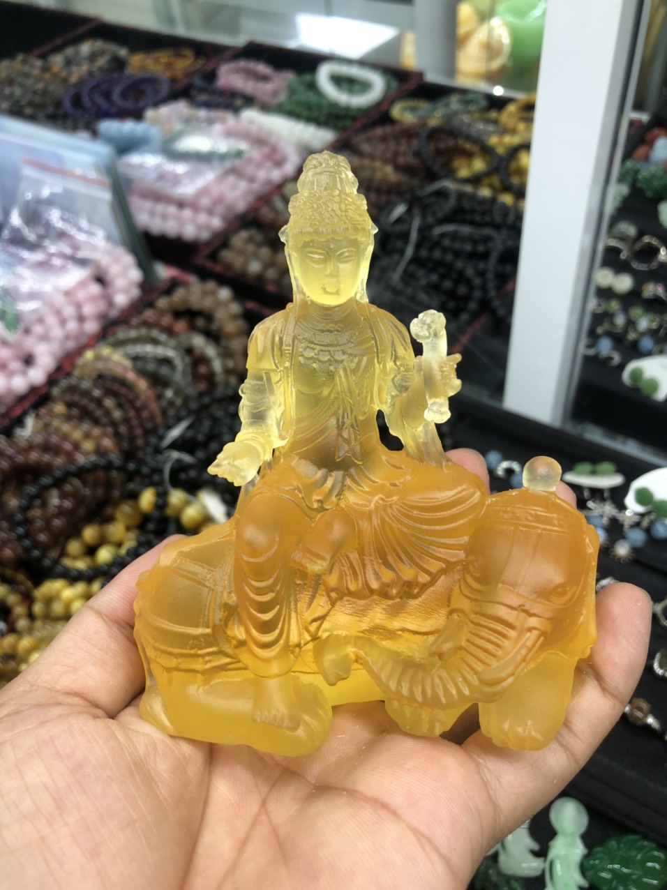 Tượng Phật Quan Âm Đá Lưu Ly Vàng Mới để trong xe hơi hoặc để bàn cao 12cm đk 7cm đế 5cm Mệnh Kim mệnh Thổ mệnh Thủy ạ *** Tượng Phật Quan Âm Đá