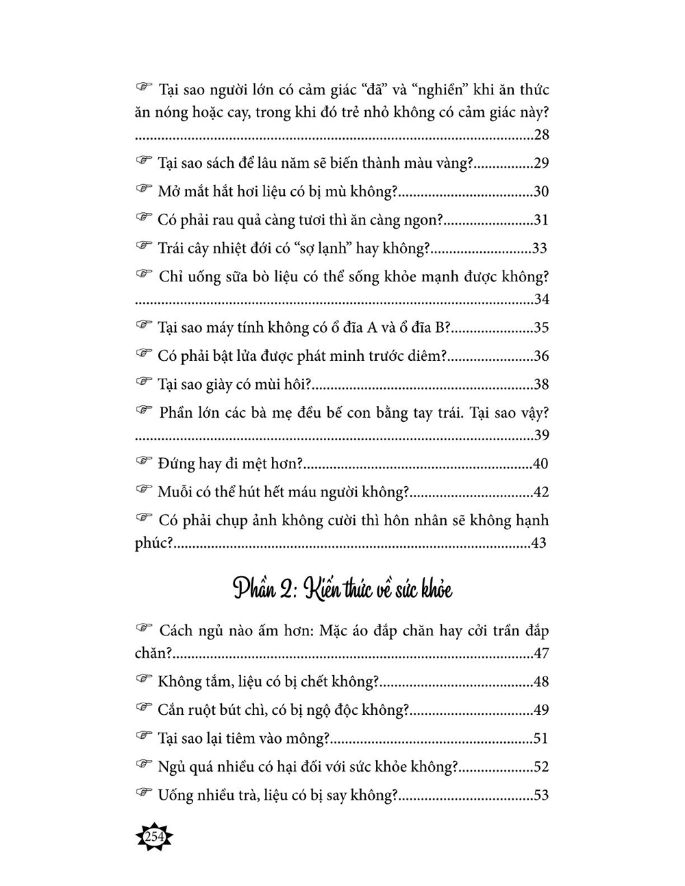 Sách cung cấp các kiến thức về cuộc sống, sức khỏe, động vật, ẩm thực, cơ thể con người, giải trí, lịch sử, văn hóa, khoa học kỹ thuật, về thế giới…nhằm giúp chúng
