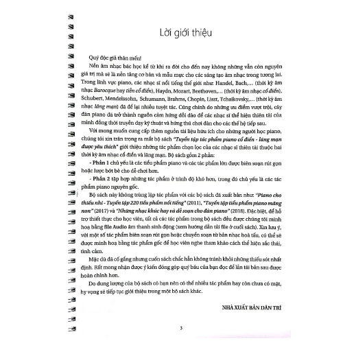 Bộ sách giới thiệu các tác phẩm piano được nhiều người yêu thích của những nhạc sĩ thiên tài thuộc hai thời kỳ âm nhạc cổ điển và lãng mạn, hoàn toàn không trùng lặp với các ấn phẩm đã phát hành như: “Piano cho thiếu nhi – Tuyển tập 220 tiểu phẩm nổi tiếng” (2011), “Tuyển tập tiểu phẩm piano măng non” (2017) và “Những nhạc khúc hay và dễ soạn cho đàn piano” (2018). Đặc biệt, để hỗ trợ thiết thực cho học viên, tất cả các tác phẩm trong bộ sách đều được minh họa qua file Audio âm thanh sinh động. Ngoài ra, chất lượng in cao cấp, thiết kế thoáng đẹp với gáy xoắn, thuận tiện khi đặt trên giá nhạc để thị tấu cũng là những ưu điểm của bộ sách này .