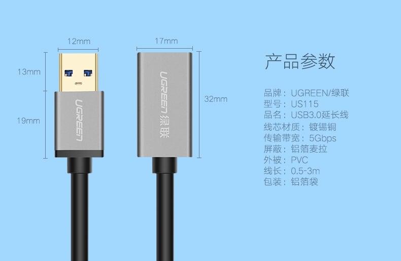 Ugreen 20826 5m usb 3.0 extension cable đen us175 1. Length : 5M 2. Color : Black 3. USB Version : 3.0 4. Data Transfer Link Cable USB 3.0 5. 300 g 6. 20 x