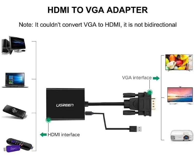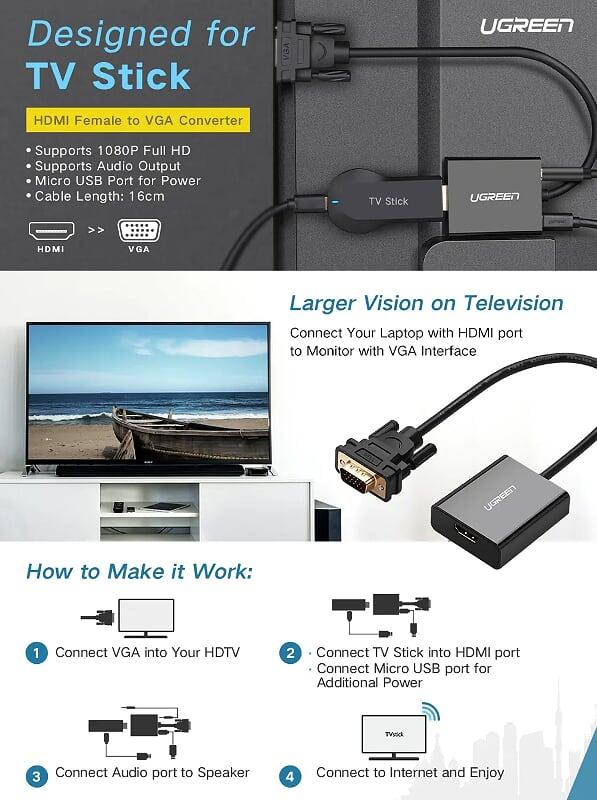 - Bộ Chuyển Đổi Ugreen HDMI Sang VGA Audio Cáp Tròn Có Nguồn Phụ 40253 giúp kết nối máy tính xách tay, Macbook, Chromebook, Rasberry Pi với giao diện HDMI để chiếu, hiển thị, màn hình