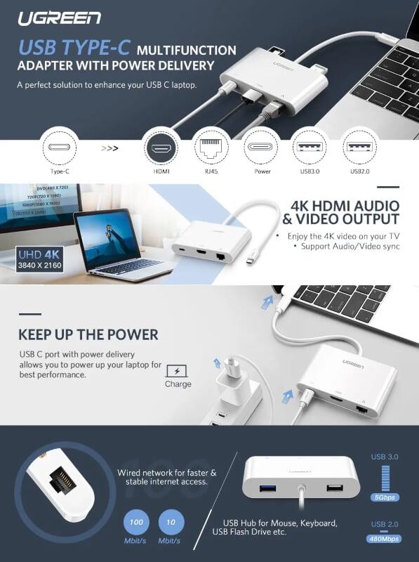 ✨Ugreen UG30440US182TK Bộ chuyển đổi TYPE C sang USB 3.0 + USB 2.0 + HDMI + LAN + hỗ trợ nguồn TYPE C - HÀNG CHÍNH HÃNG