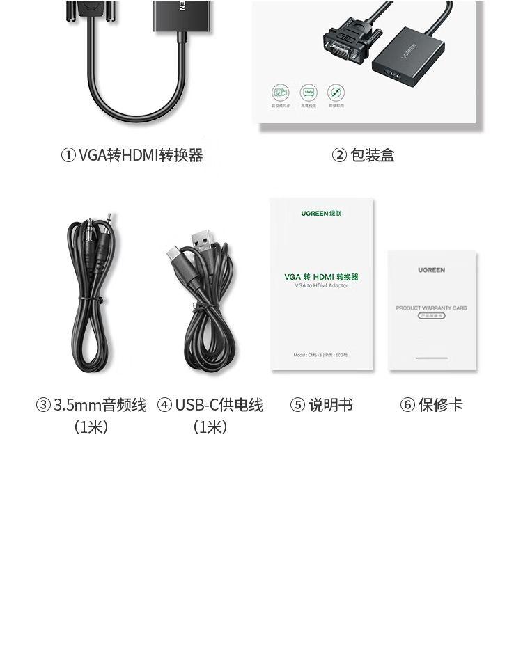 ✨Ugreen UG50945CM513TK 15CM 1920x1080 60Hz Bộ chuyển đổi VGA sang HDM kèm cáp nguồn USB-C dài 1M + cổng 3.5mm Màu Đen - HÀNG CHÍNH HÃNG