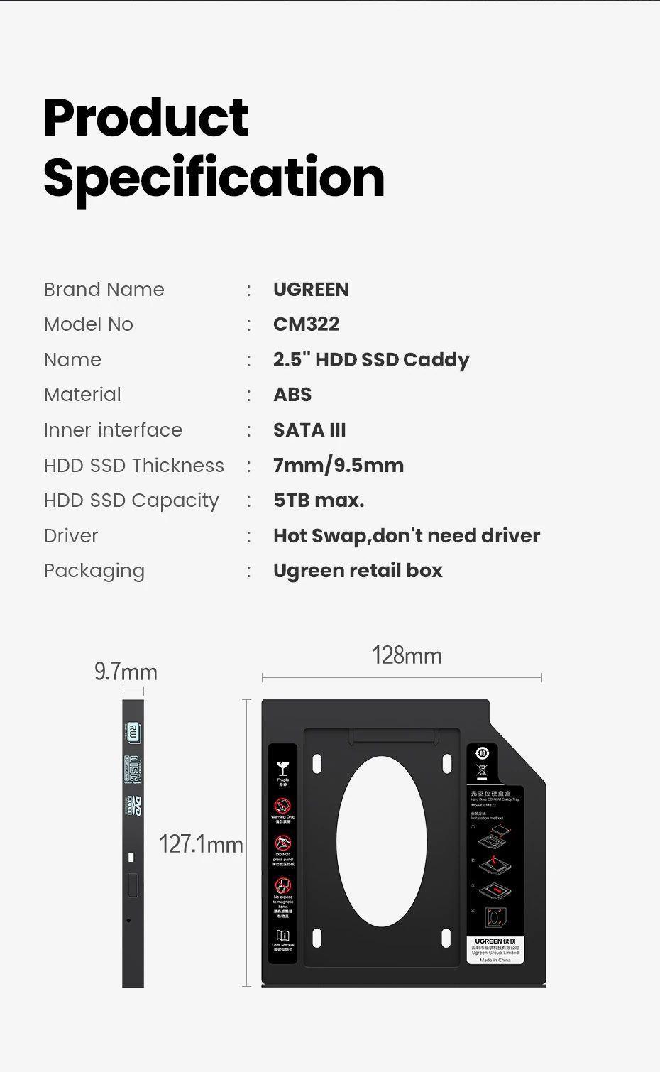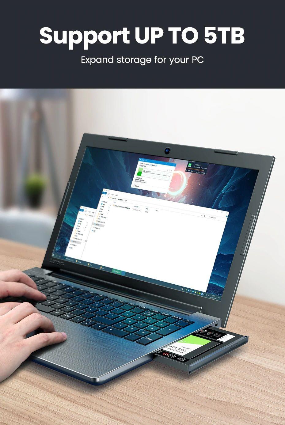 UGREEN HDD Caddy 9.5mm Universal SATA 3.0 HDD Caddy for 2.5" 5TB SSD Case Hard Disk Enclosure for Laptop DVD-ROM Optical Bay